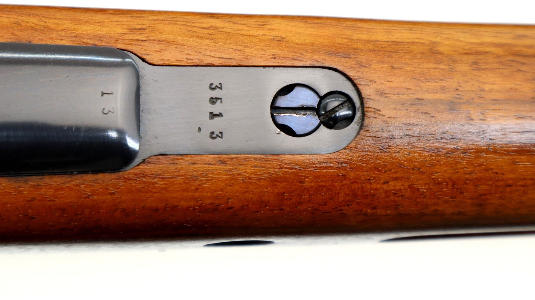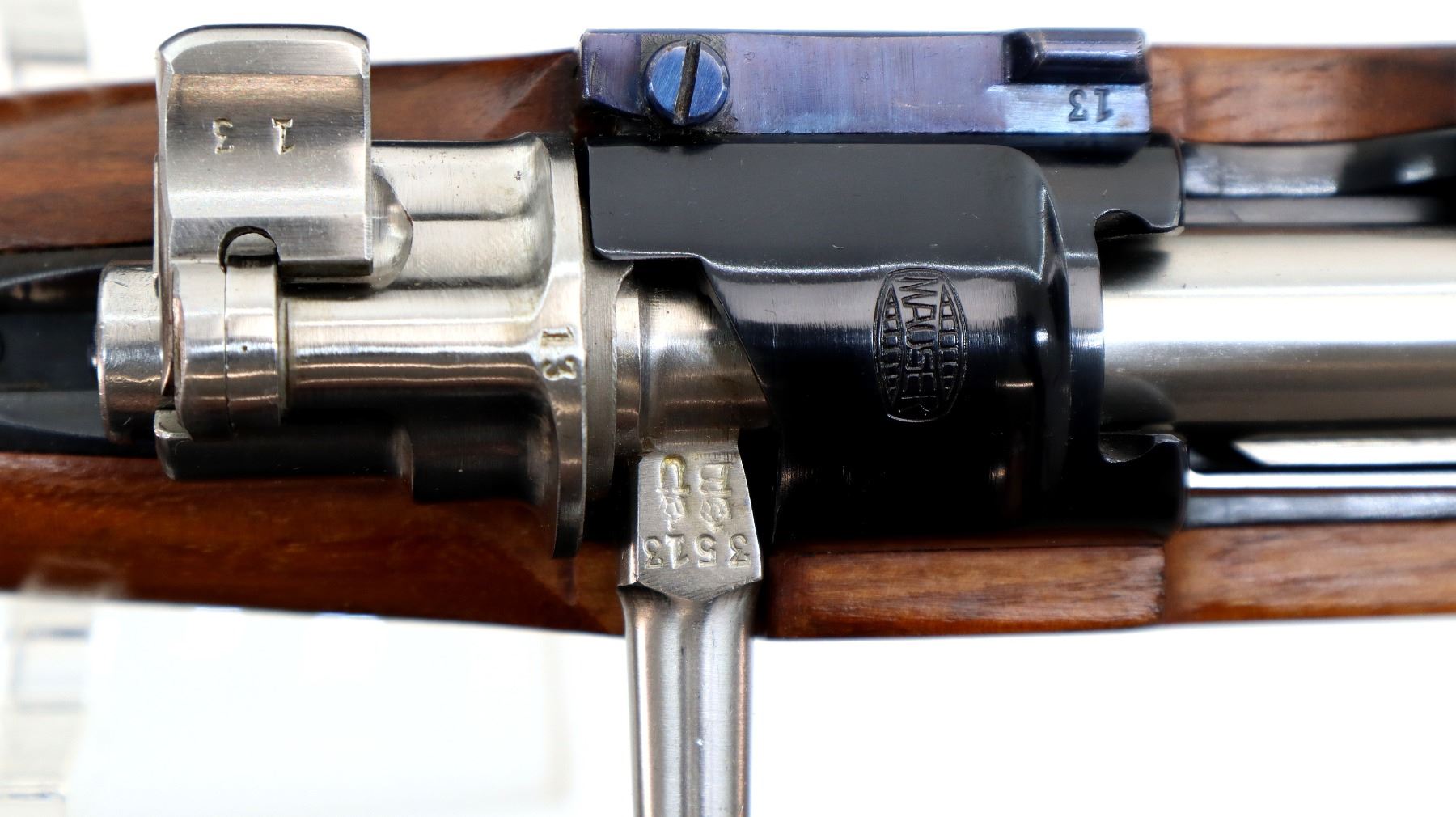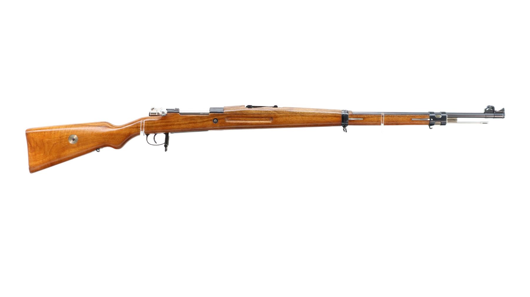 Main Description: Manufactured by Mauser Oberndorf, visible serial numbers match. Barley corn front sight with ramp, adjustable u notched rear sight, polished blued finish, Brazilian crest on receiver ring, Mauser Banner on rear bridge, silver bolt with straight handle. Two piece full military wood stocks, finger grooved forearm, pistol grip, smooth steel butt plate, unmarked steel stock disk, sling swivels, bayonet lug, cleaning rod.