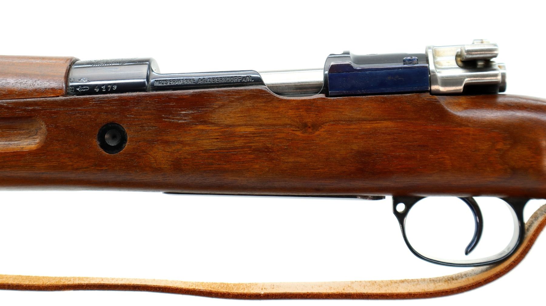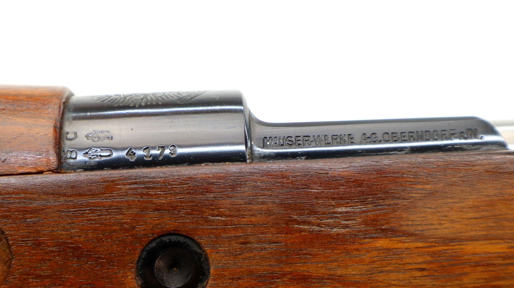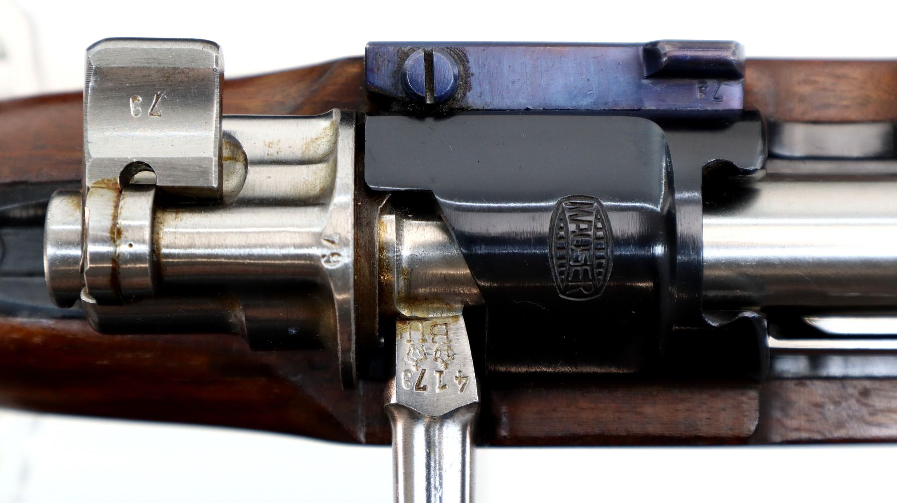 Main Description: Manufactured by Mauser Oberndorf, visible serial numbers match. Barley corn front sight with ramp, adjustable u notched rear sight, polished blued finish, Brazilian crest on receiver ring, Mauser Banner on rear bridge, silver bolt with straight handle. Two piece full military wood stocks, finger grooved forearm, pistol grip, smooth steel butt plate, unmarked steel stock disk, sling swivels with brown leather military sling, bayonet lug, cleaning rod. Matching Bayonet has polished blade, two piece wood grips, blued steel scabbard.