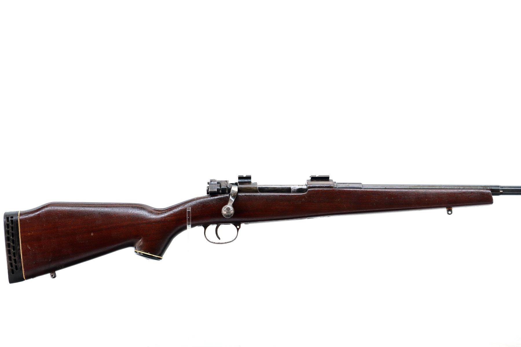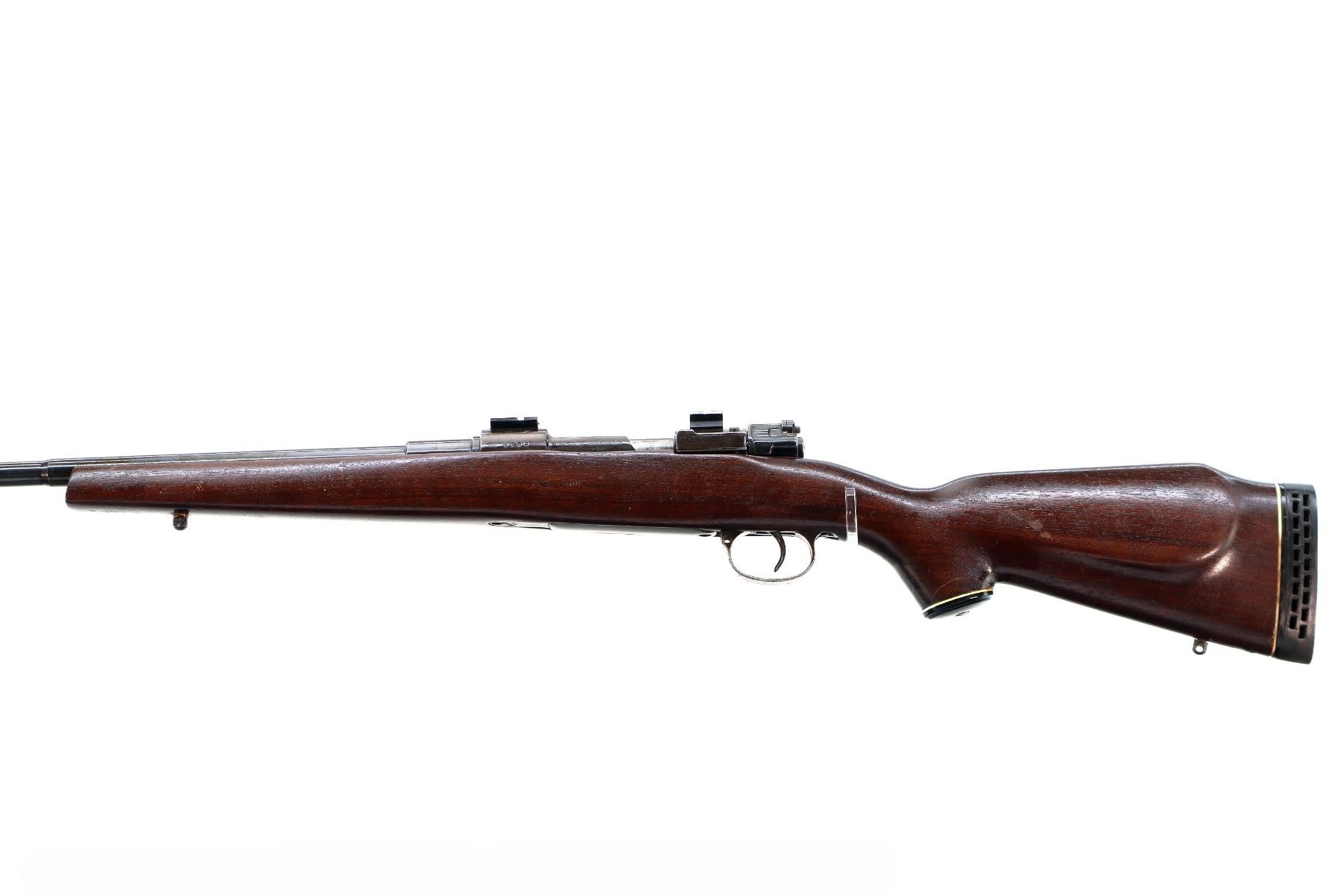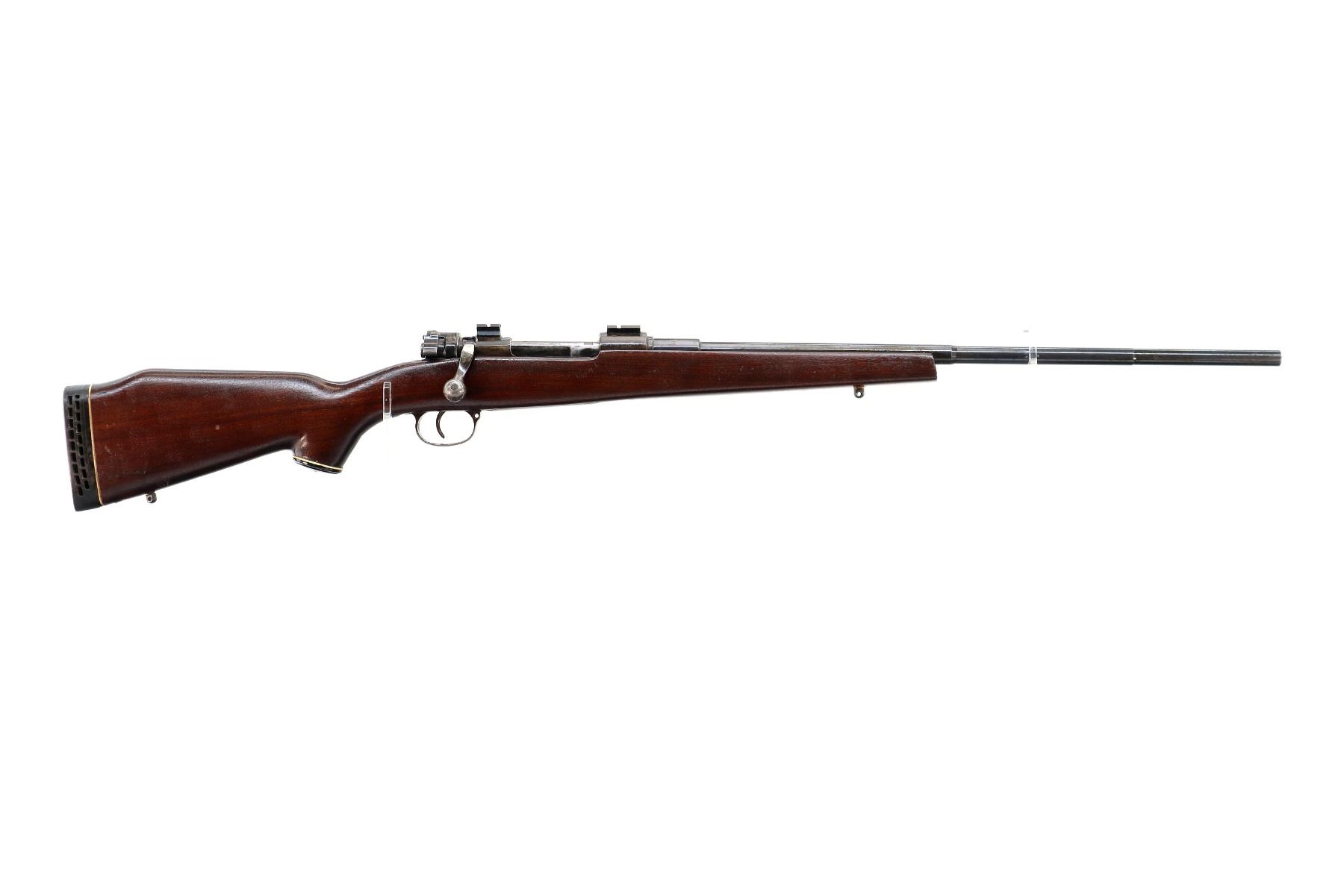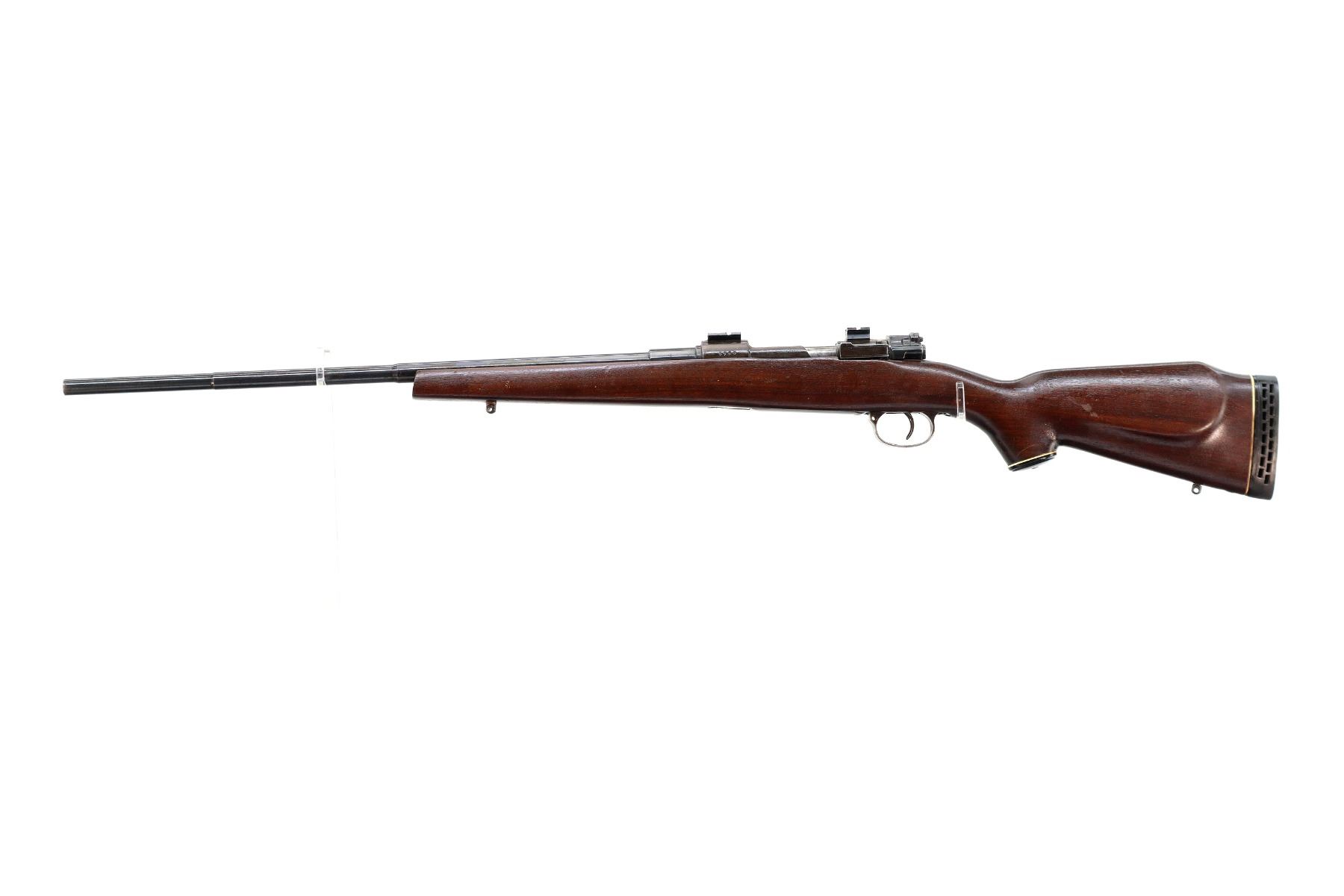 Main Description: No sights, blued finish, receiver drilled and tapped with two piece scope bases installed, modified bolt handle with checkered flat bottomed knob, low scope safety. One piece sporter wood stock, pistol grip cracked behind receiver, cheek rest, black vented rubber recoil pad, 13.25" LOP, grip cap, swivel studs.