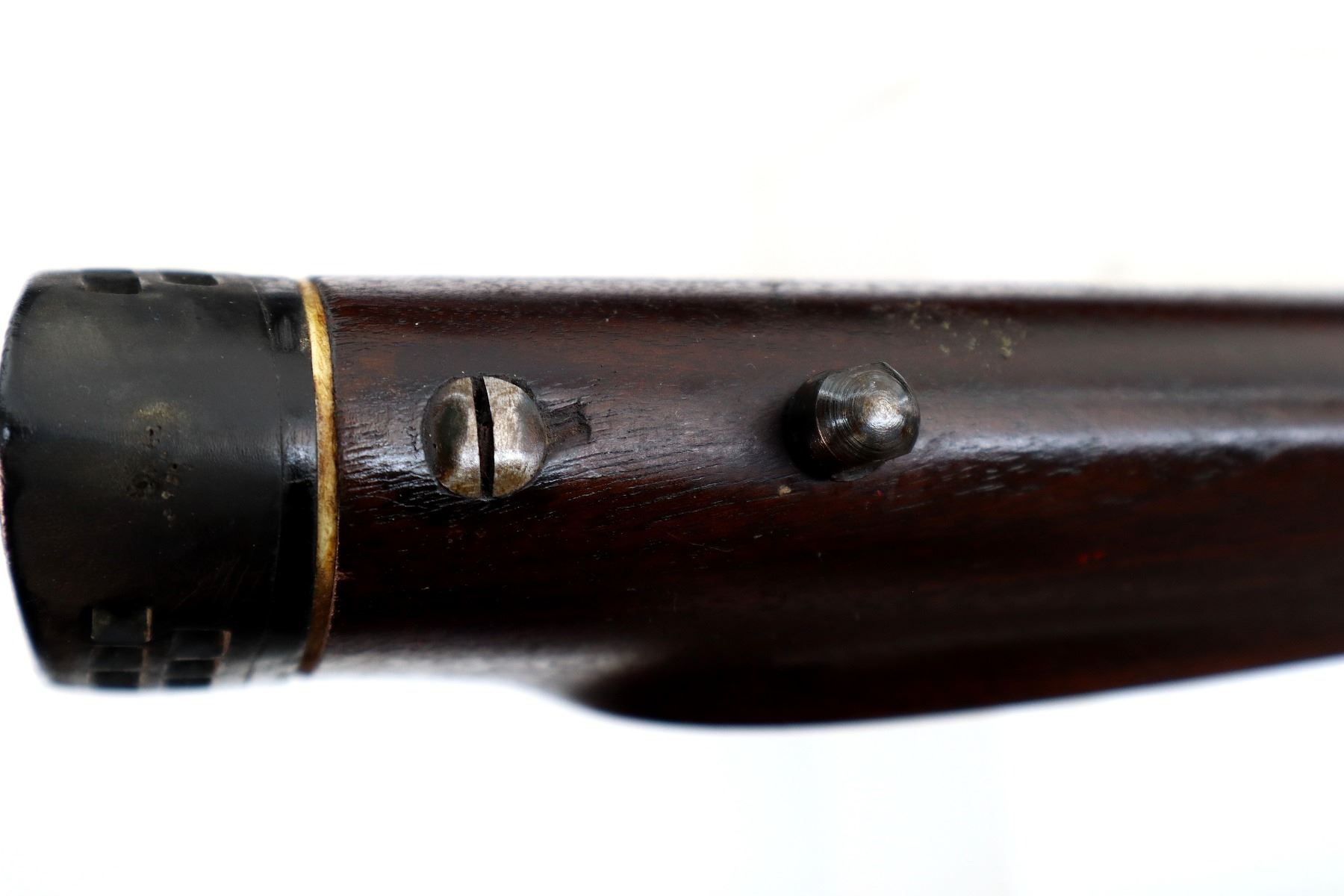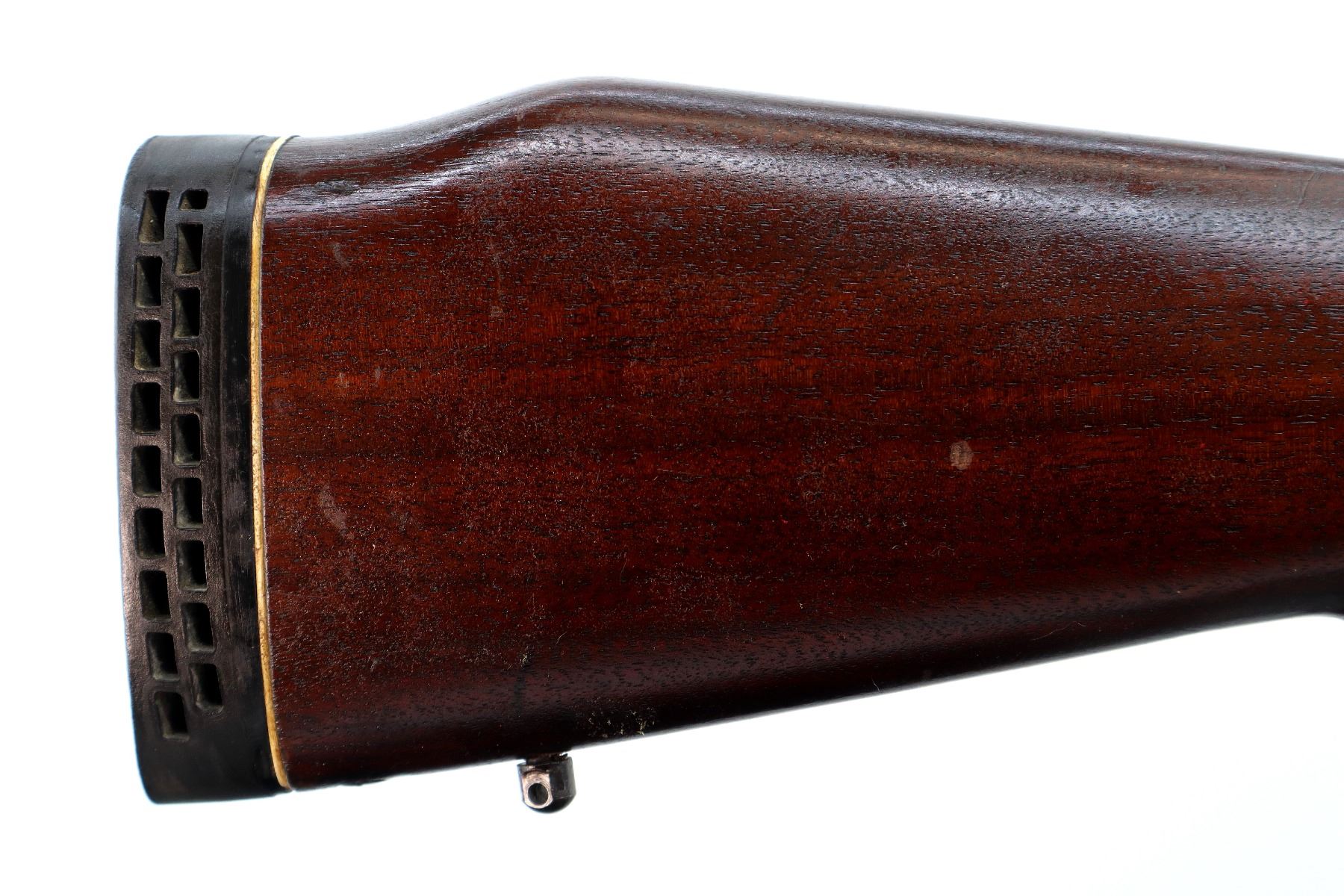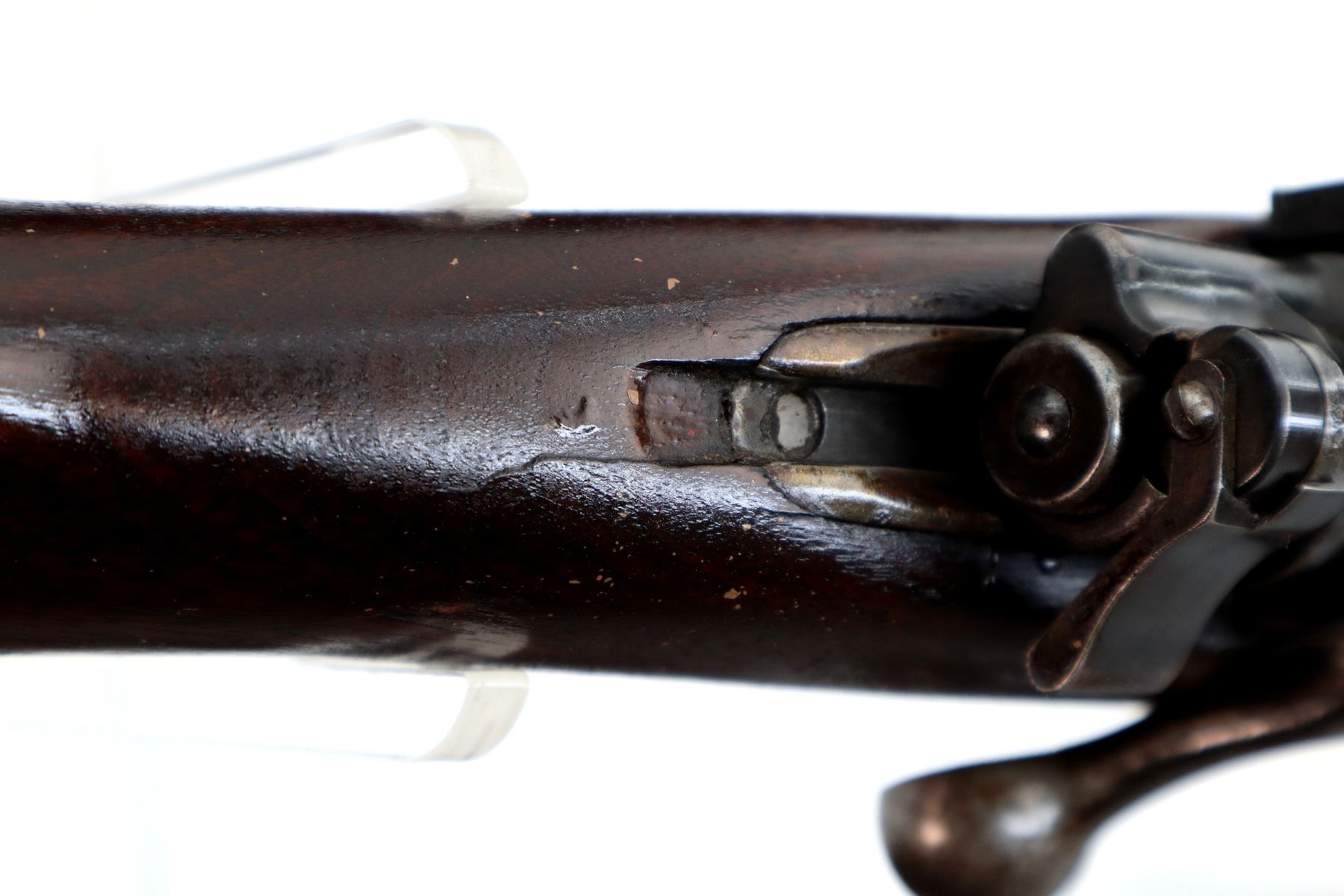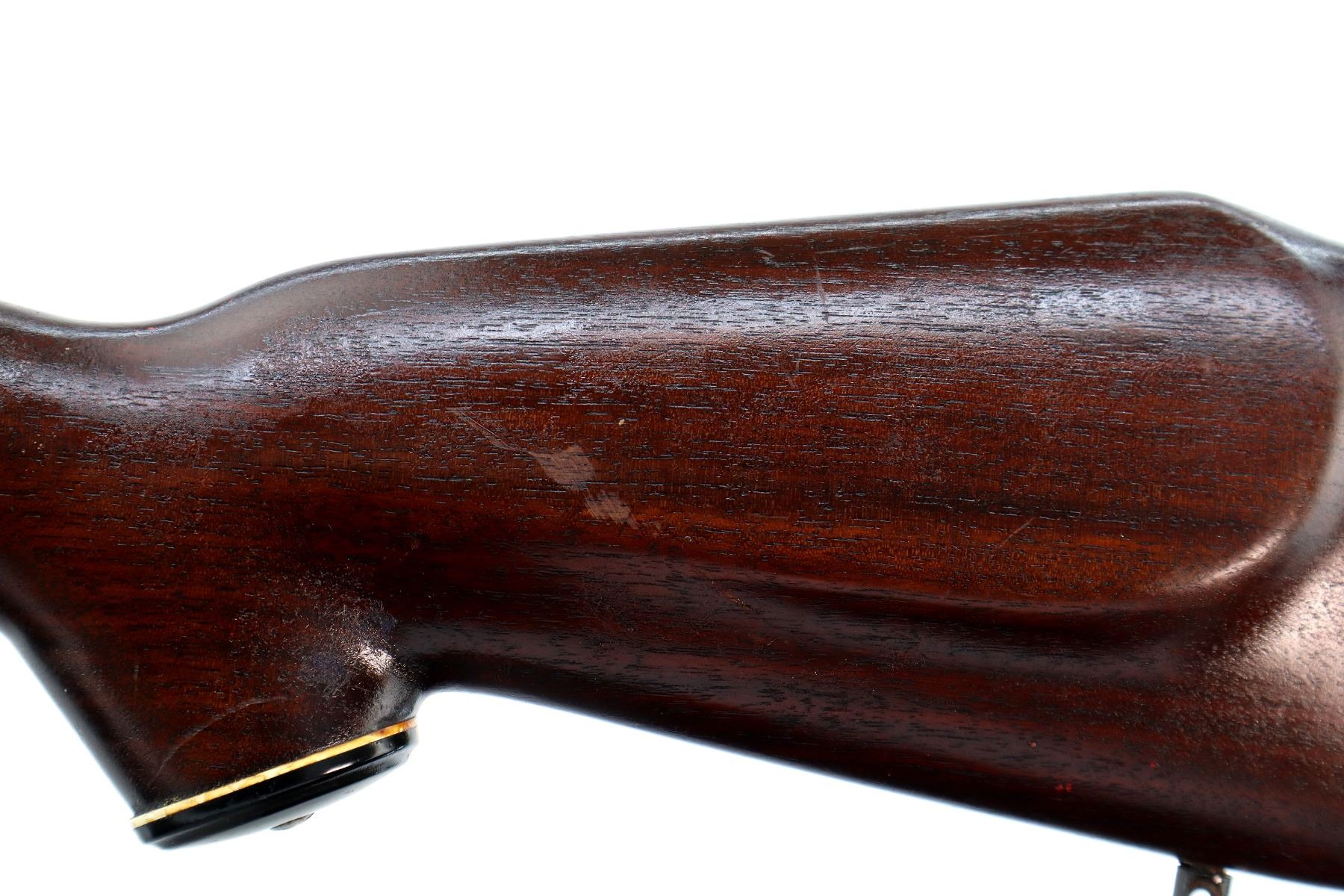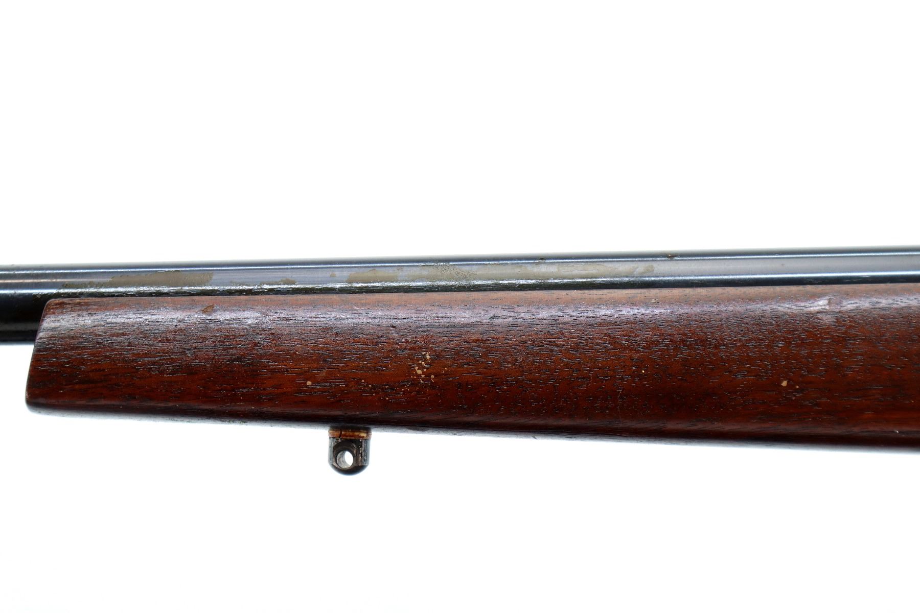 Main Description: No sights, blued finish, receiver drilled and tapped with two piece scope bases installed, modified bolt handle with checkered flat bottomed knob, low scope safety. One piece sporter wood stock, pistol grip cracked behind receiver, cheek rest, black vented rubber recoil pad, 13.25" LOP, grip cap, swivel studs.