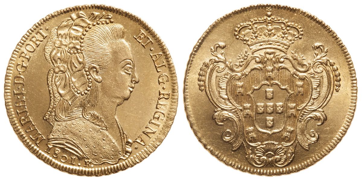 6400 Reis 1801R. KM 226.1. Gold; Rio, Brasil. Uncirculated.