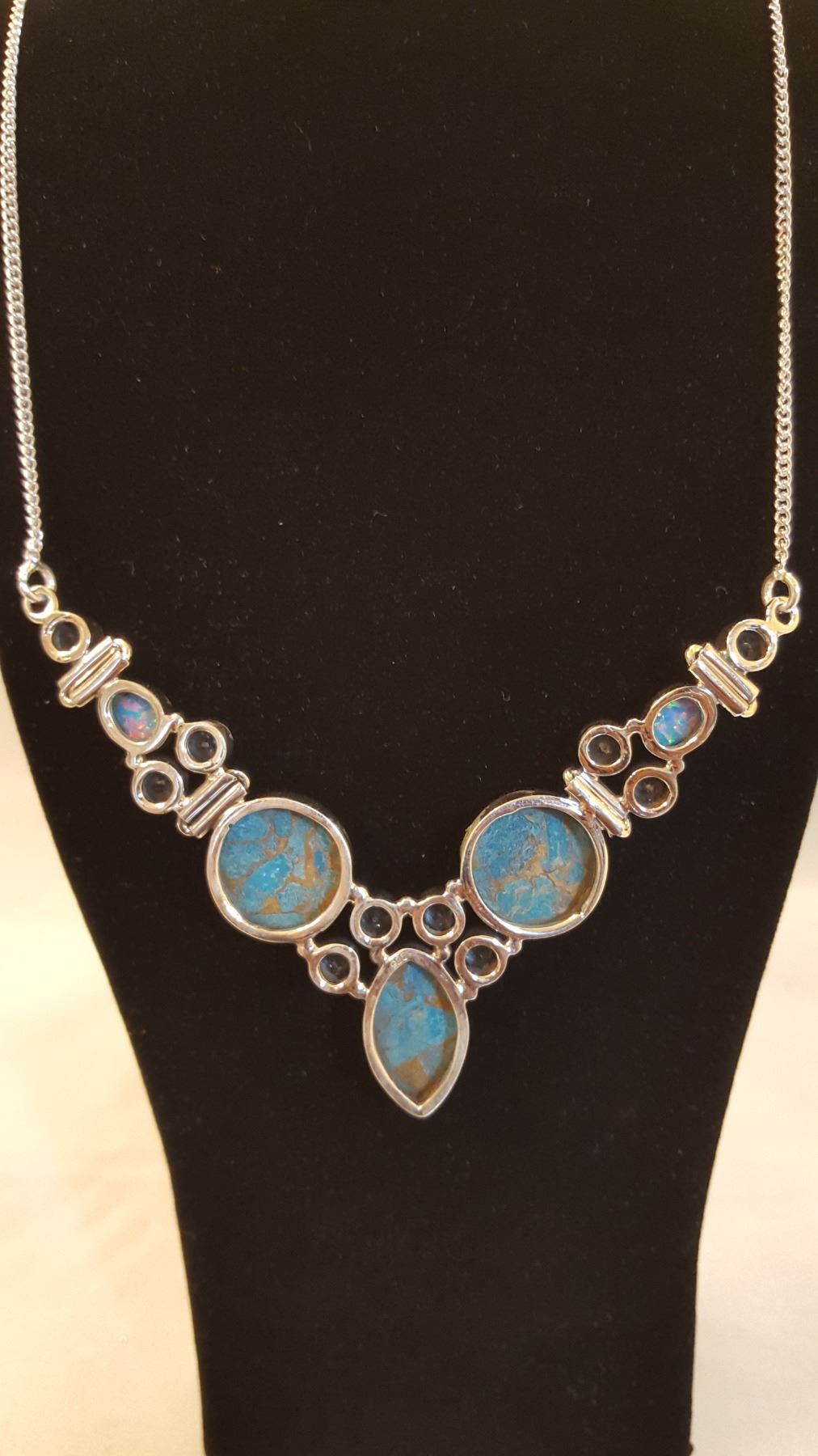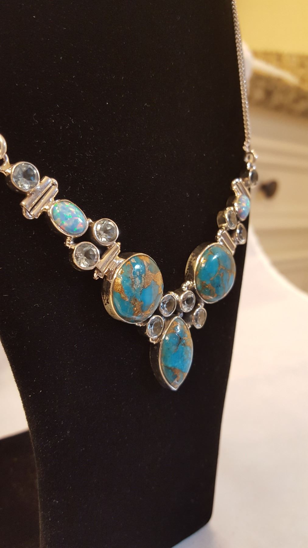 BREATHTAKING NATURAL ARIZONA BLUE TURQUOISE AND COPPER ACCENT NECKLACE. INCLUDES 8 SKY BLUE TOPAZ HIGHLIGHT STONES. MOUNTED IN SOLID .925 STERLING SILVER. 19" LONG STERLING SILVER CHAIN. 22 GRAM TOTAL WEIGHT. TURN SOME HEADS WITH THIS NECKLACE LADIES.