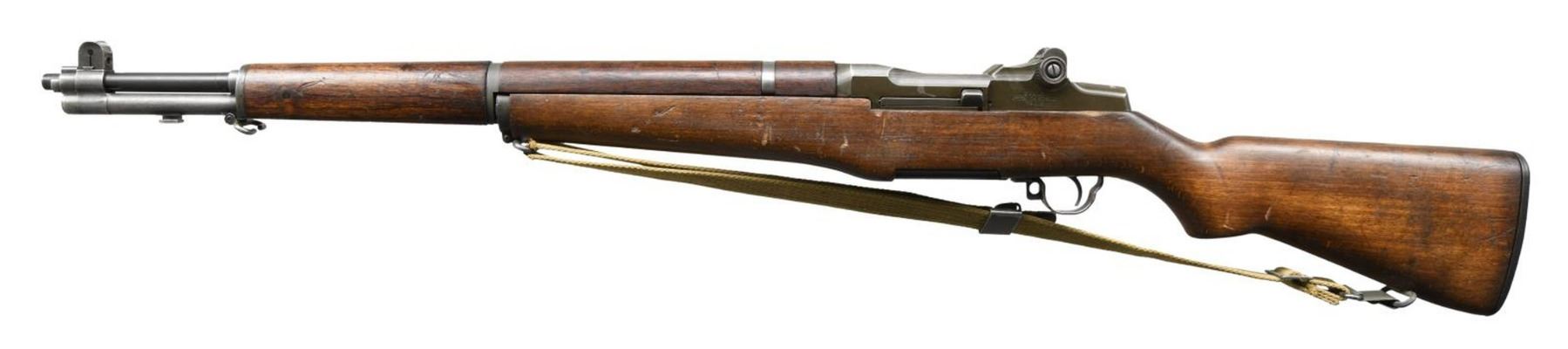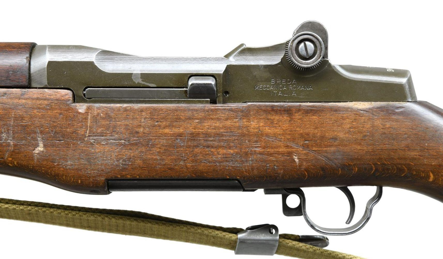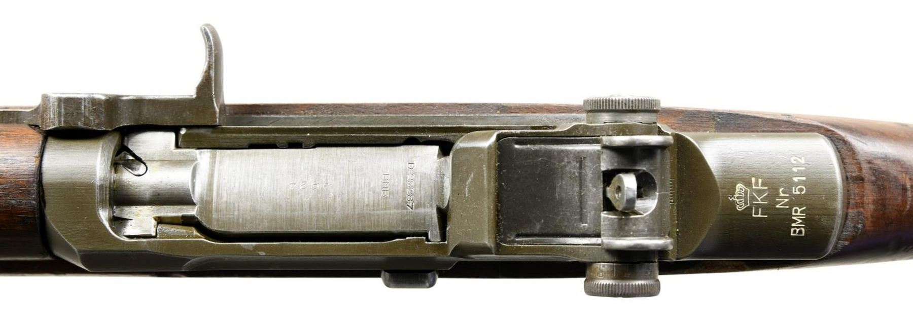 Cal. 30-06. S# BMR5112. Bbl. 24" marked "B.SID.59 1955". BMB marked blade front sight w/ protective ears. Aperture rear sight. Elevation knob marked "WCE". Rear sight ears & windage knob marked "BMR". Top of receiver marked w/ crown over "FKF" denoting Danish issue & serial number. Left side of receiver marked w/ Breda markings. Gas cyl., rear handguard clip, bolt, op rod, trigger, safety, follower rod, & trigger housing all have "BMB" markings. Bolt has additional electro pencil number "1203". Other parts appear unmarked. Beech stock w/ walnut handguards. Underside of butt has matching number "5112". Bottom mounted sling swivels w/ GI style canvas sling. CONDITION: stock set shows scattered dings, a few abrasions & handling marks. Metal retains 50% arsenal parkerized finish w/ scattered thinning & fading most notably on the gas cyl. assembly. Good bright bore w/ some light frosting. PROVENANCE: From the estate collection of Thomas J. Mulligan. (23-1211/MJC). CURIO. $1000-1500.