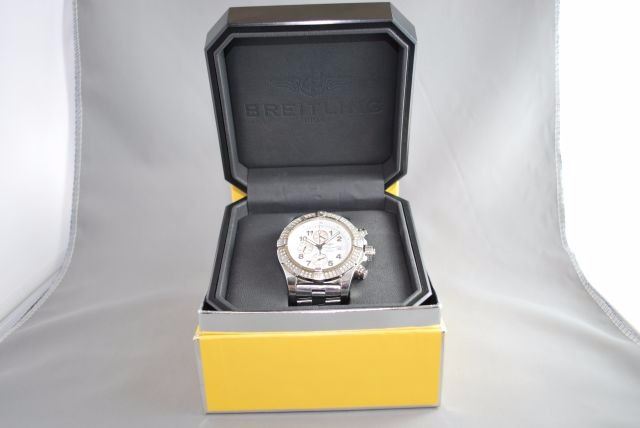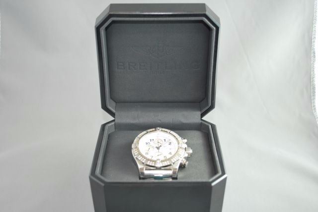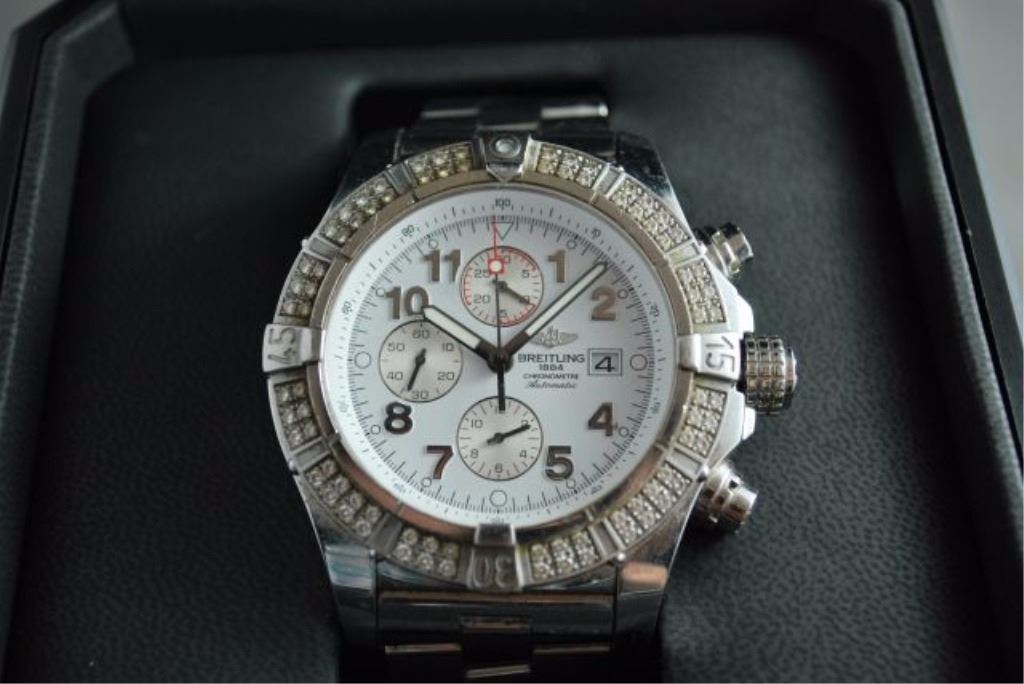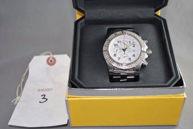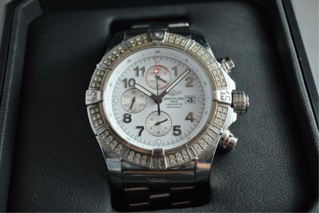 ONE USED 48MM BREITLING SUPER AVENGER WITH DIAMOND BEZEL REFERENCE A13370 IN STAINLESS STEEL WITH WHITE DIAL HAVING SAPPHIRE CRYSTAL, AUTOMATIC THREE REGISTER CHRONOGRAPH MOVEMENT, STAINLESS STEEL BREITLING BRACELET, INCLUDING BOX AND PAPERS. CURRENT REPLACEMENT VALUE OF LIKE KIND AND QUALITY. $17,500. ALL ESTIMATES AND VALUES ARE APPROXIMATE AND USED FOR GUIDELINES ONLY.