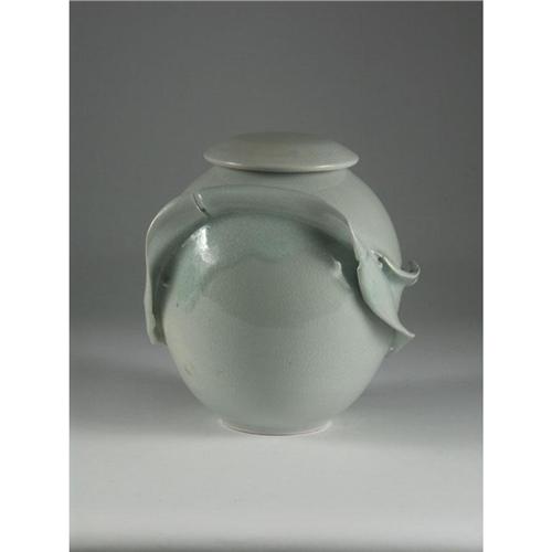 ART POTTERY: Signed bulbous vase with round domed lid and affixed vegetal flange, shiny light celadon glaze, attributed to Brenda and Alan Newman. 12'' x 9''