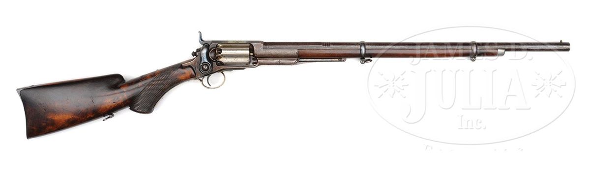 Cal. 65. This is a most interesting gun which has engraved bbl, frame, trigger guard and hammer, and nickel plated cylinder. Two bbl bands are friction and screw fit over a straight 17" apparently walnut stock with pewter nosecap. The buttstock is over sized, apparently made from a wide grain wood not normally seen on American guns. Buttstock is pistol gripped and is much wider than the frame, about 1-3/4" at its thickest with the frame just less than 1". Bbl shows more wear than rest of gun and engraving appears Mediterranean. Proof marks on bbl are 2 square cartouches with only partially discernible markings. Engraving on frame and trigger guard are definitely in a different hand and a different "flavor" than remainder of gun. A dog pointing to a bird is engraved on bottom of trigger bow and the same dog is seen on top of frame tang. No idea as to origin of this gun, but it appears all orig and well made. CONDITION: 26-3/8" smooth bore bbl is part oct, changing to rnd with 3 rings as interface. Bbl is overall brown with staining and pitting. Frame is brown with traces of blue finish, is engraved with various floral and geometric designs and 1-3/4" panel of dog. German silver trigger guard is engraved with dog and bird. Hammer is florally engraved with traces of blue finish. Cylinder is nickel plated and retains 95% of its nickel with areas of bubbling, rust and pitting. Stocks are sound and solid with a 1-1/4" German silver star inset into bottom of pistol grip with a central brass stud. Mechanically gun functions well. 4-48624 JS45