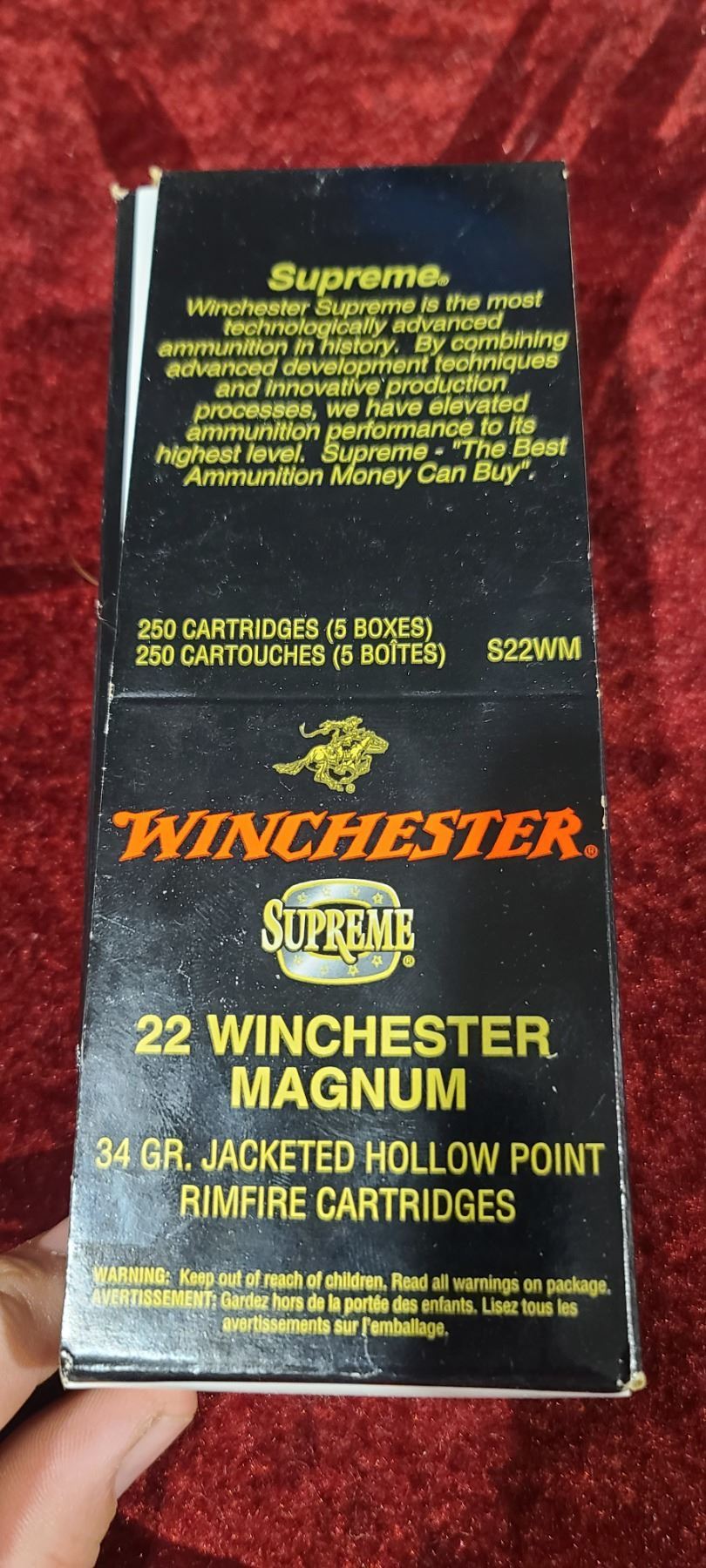 BRICK (250RNDS) OF WINCHESTER SUPREME .22WIN MAG 34GR JACKETED HOLLOW POINT (JHP)