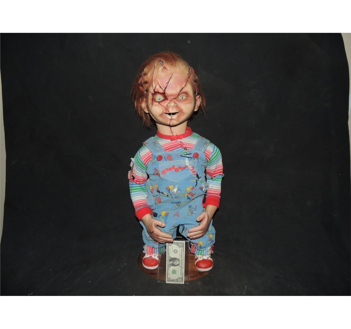 As shown he is comprised of props from BRIDE OF CHUCKY and SEED OF CHUCKY. The animatronic head with acrylic eyes and teeth, The silicone head skin with hand punched hairs, and body with legs are from BRIDE OF CHUCKY. The animatronics have mostly been removed.