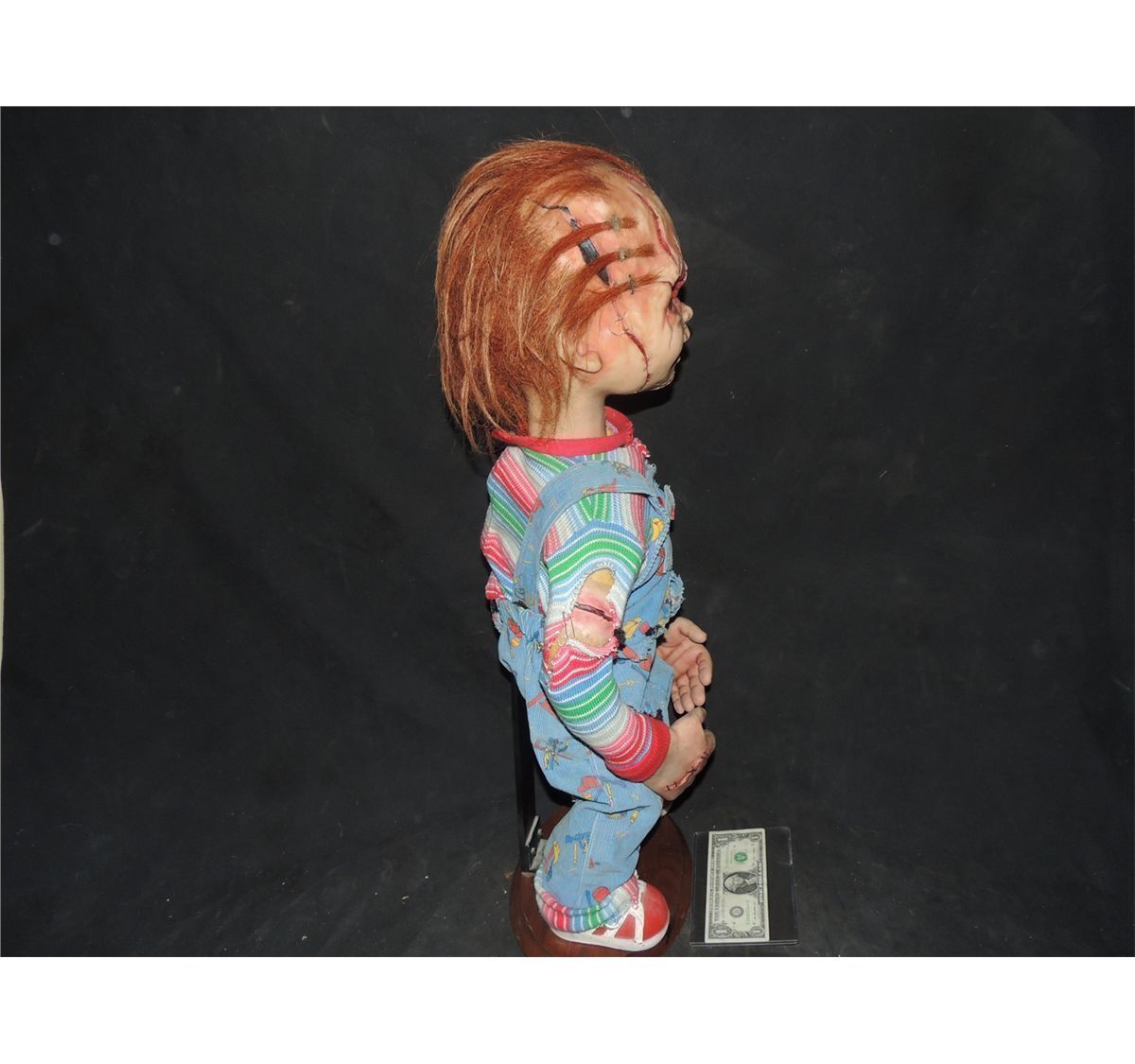 As shown he is comprised of props from BRIDE OF CHUCKY and SEED OF CHUCKY. The animatronic head with acrylic eyes and teeth, The silicone head skin with hand punched hairs, and body with legs are from BRIDE OF CHUCKY. The animatronics have mostly been removed.