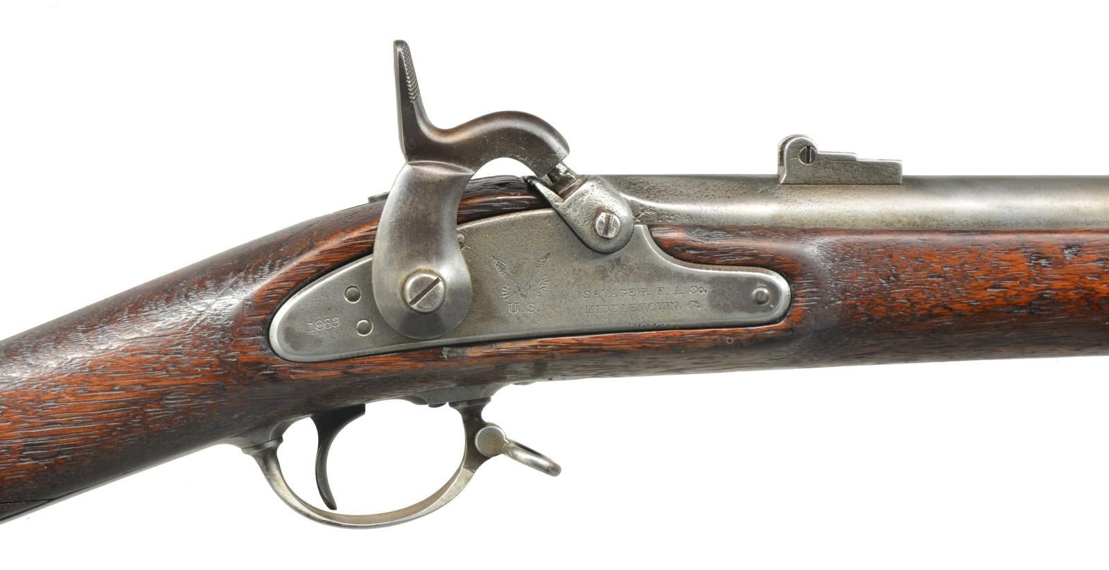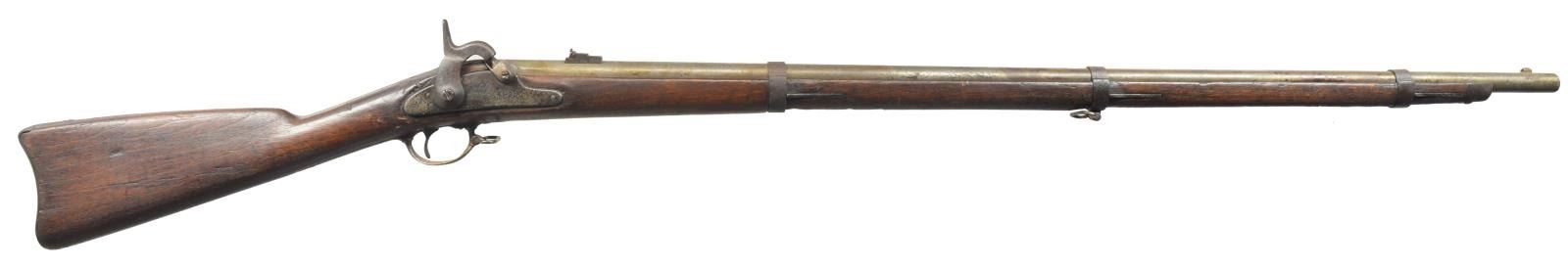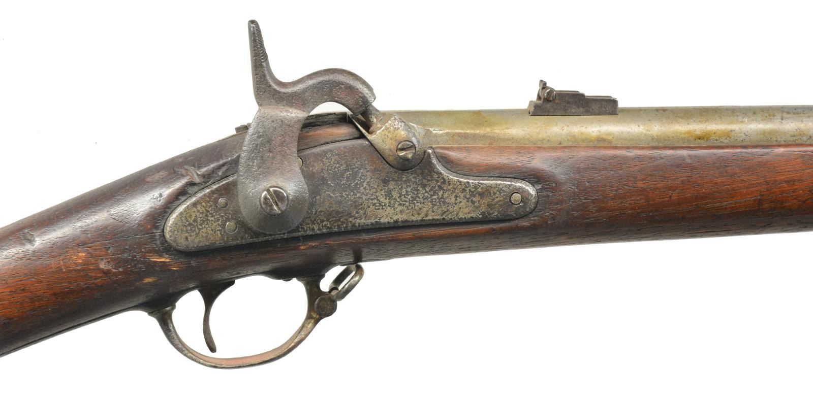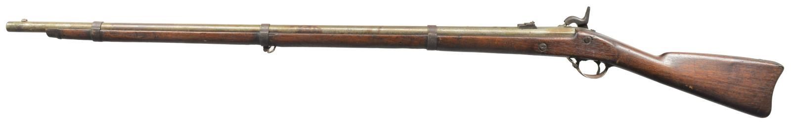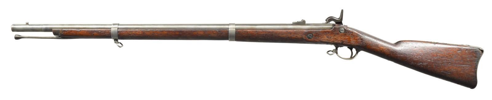 RIFLE-MUSKETS. ALL: cal. 58. NSN. 1) BRIDESBURG. Bbl. 40" w/ barleycorn front sight, 2 leaf rear sight has 1 broken leaf. 1863 Dated Bridesburg lock. 3 Band walnut stock w/ iron fittings. CONDITION: bbl. has mottled gray brown patina w/ pitting showing filing & polish marks on rear portion of bbl. & top tang. Heavily pitted lock w/ partially visible markings. Buttplate & bbl. bands are heavily pitted. Stock has weather appearance w/ dents & handling marks having a crack behind lock w/ wood erosion above lock. Dark pitted bore. (01-18293/DS). 2) SAVAGE R. F. A. Co. Bbl. shortened to 32" w/ blade front sight. 2 Leaf rear sight has 1 broken leaf. 1863 Dated lock & bbl. Stock is shortened to 2 band configuration w/ iron fittings & correspondingly shortened tulip tipped ramrod. Stock forward of buttplate peak is stamped "18". CONDITION: Metal has cleaned gray appearance w/ pitting in breech area. Stock has added finish over heavy wear & handling marks w/ series of deep gouges on comb. Wrist of stock is cracked right of trigger guard. Dark lightly pitted bore. (01-18369/DS). ALL ANTIQUE. $500-700.