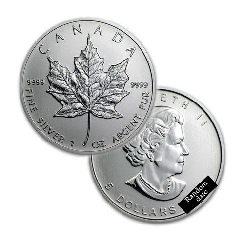 One piece Canadian $5 Silver Maple Leaf Bullion Coin 1 Oz. Contains .9999 Fine Silver. BRILLIANT UNCIRCULATED Condition - Dates Of Our Choice