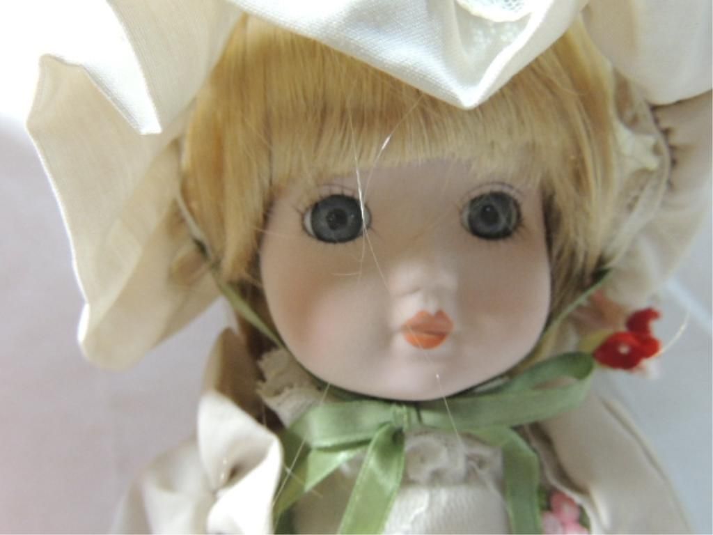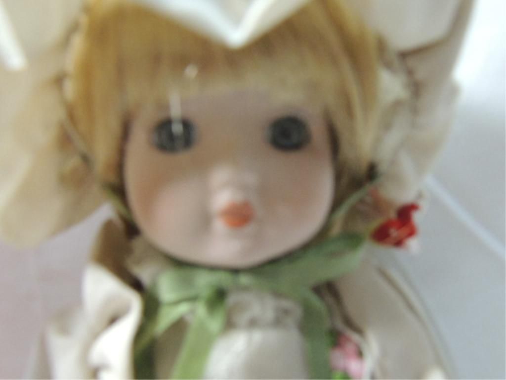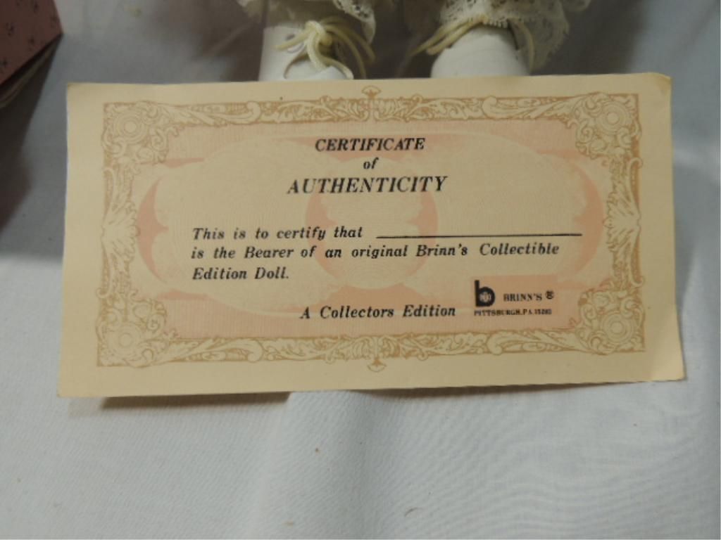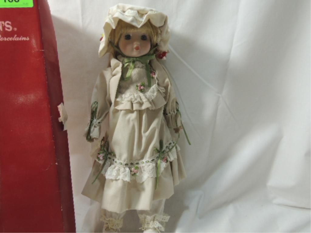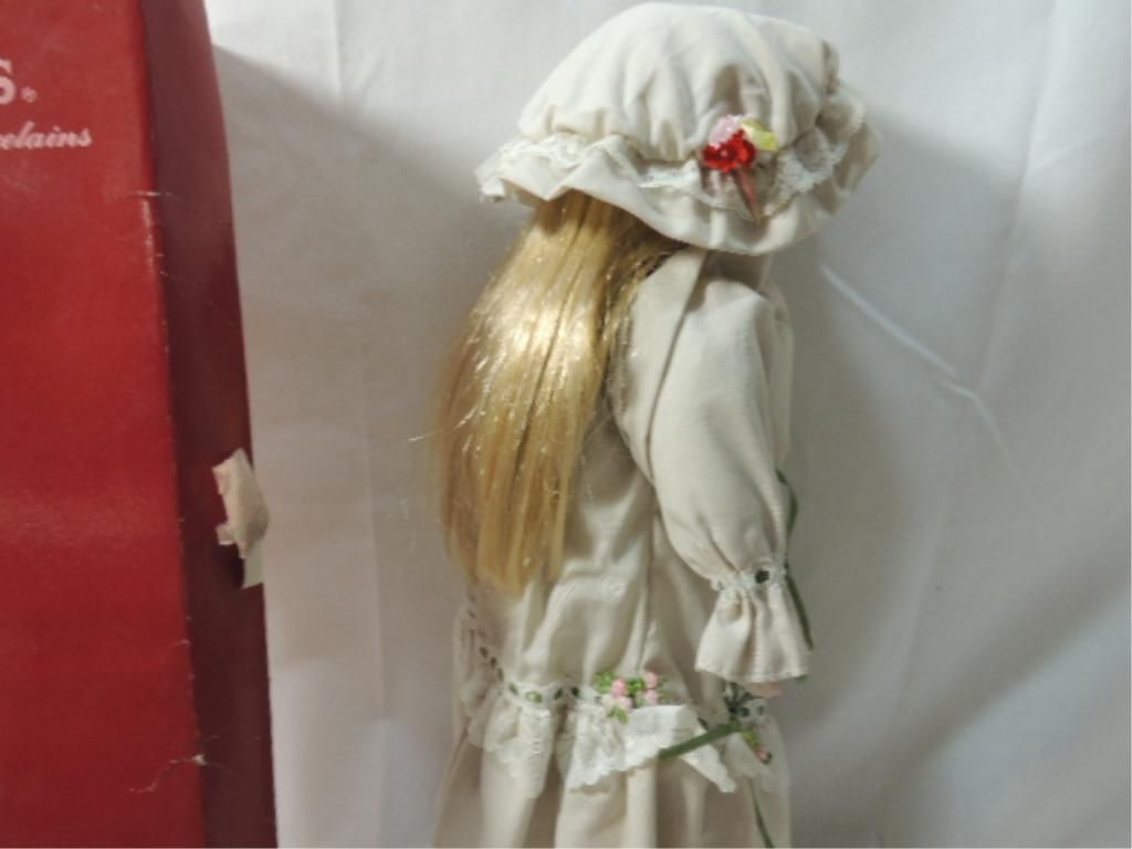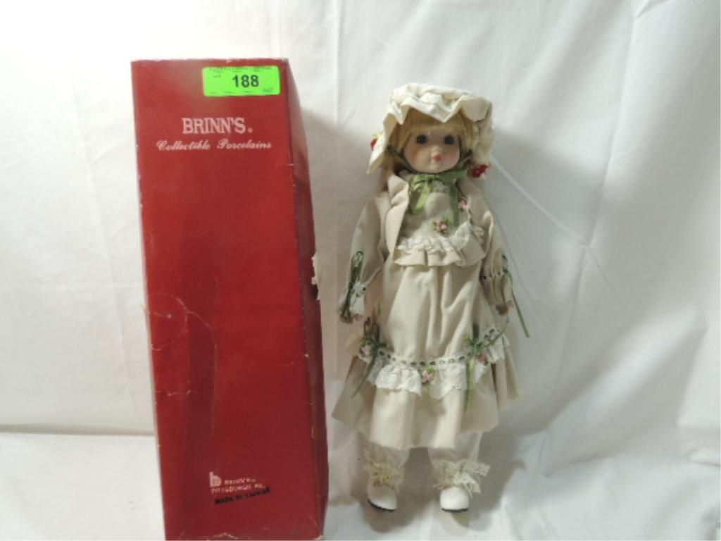 BRINNS COLLECTIBLE SARA DOLL. PORCELAIN DOLL. 18" TALL. AS SHOWN. SEE PHOTO FOR MORE DETAILS.