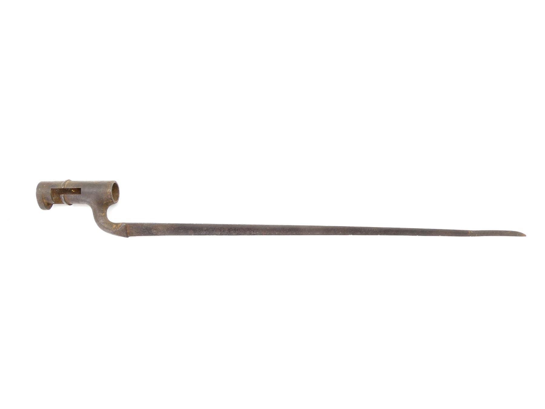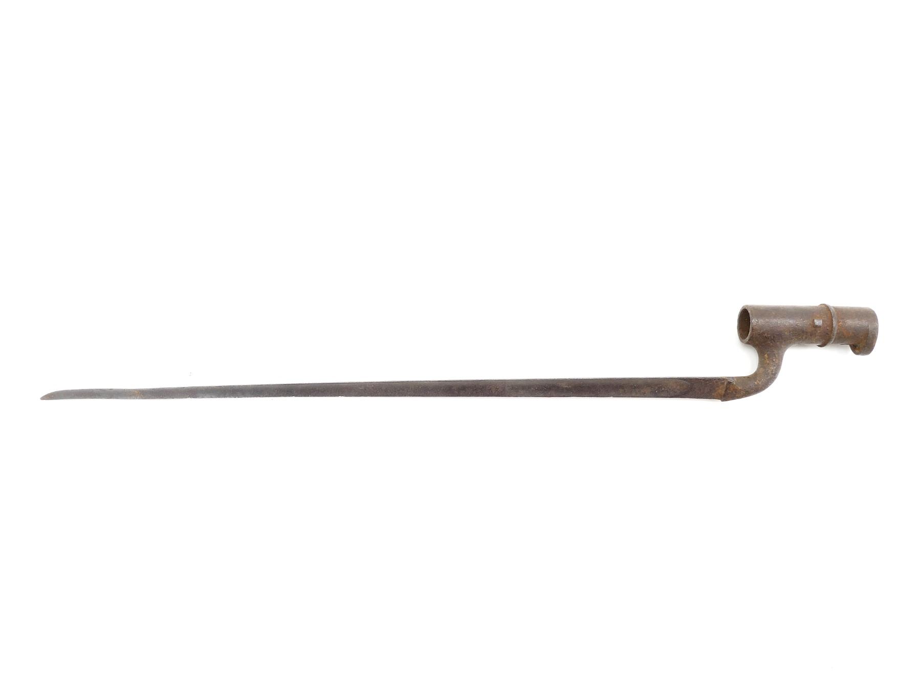 (1) FITS BRITISH 1853 ENFIELD & SNIDER-ENFIELD MUSKETS, NO LOCKING RING, FAINT PROOF MARK ON BLADE, SOCKET MARKED: "33" OVER "314", NO SCABBARD, MUZZLE RING APPROX. 0.78" DIA., BLADE APPROX. 17.25" & OAL APPROX. 20 5/8". SEE PHOTOS.