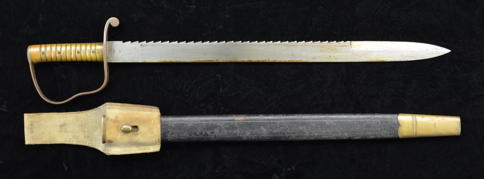 Overall: 27.5". Sawback 22.5" blade w/ "(arrow) WD", (crown), "BR/19" & "(crown) 18" proofs. Brass stirrup guard & grip. Leather scabbard w/ brass tip & throat piece. Buff frog dated 1841. CONDITION: very good blade w/ storage grease & patina. Good hilt has brown patina w/ handling marks. Fair intact scabbard w/ leather flaking & cracking. Good frog w/ stains & tight stitching. (02-16431/MD). $200-500.