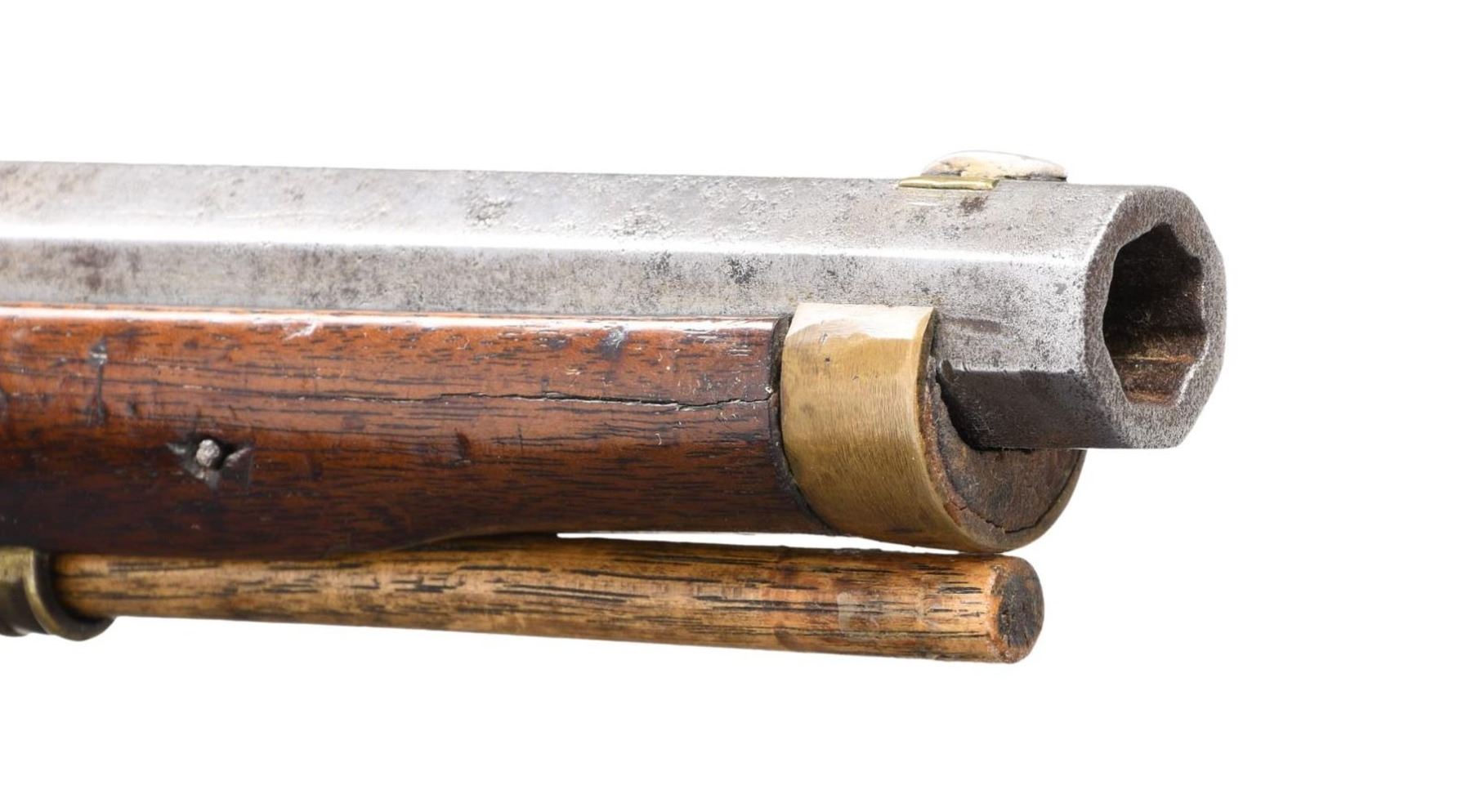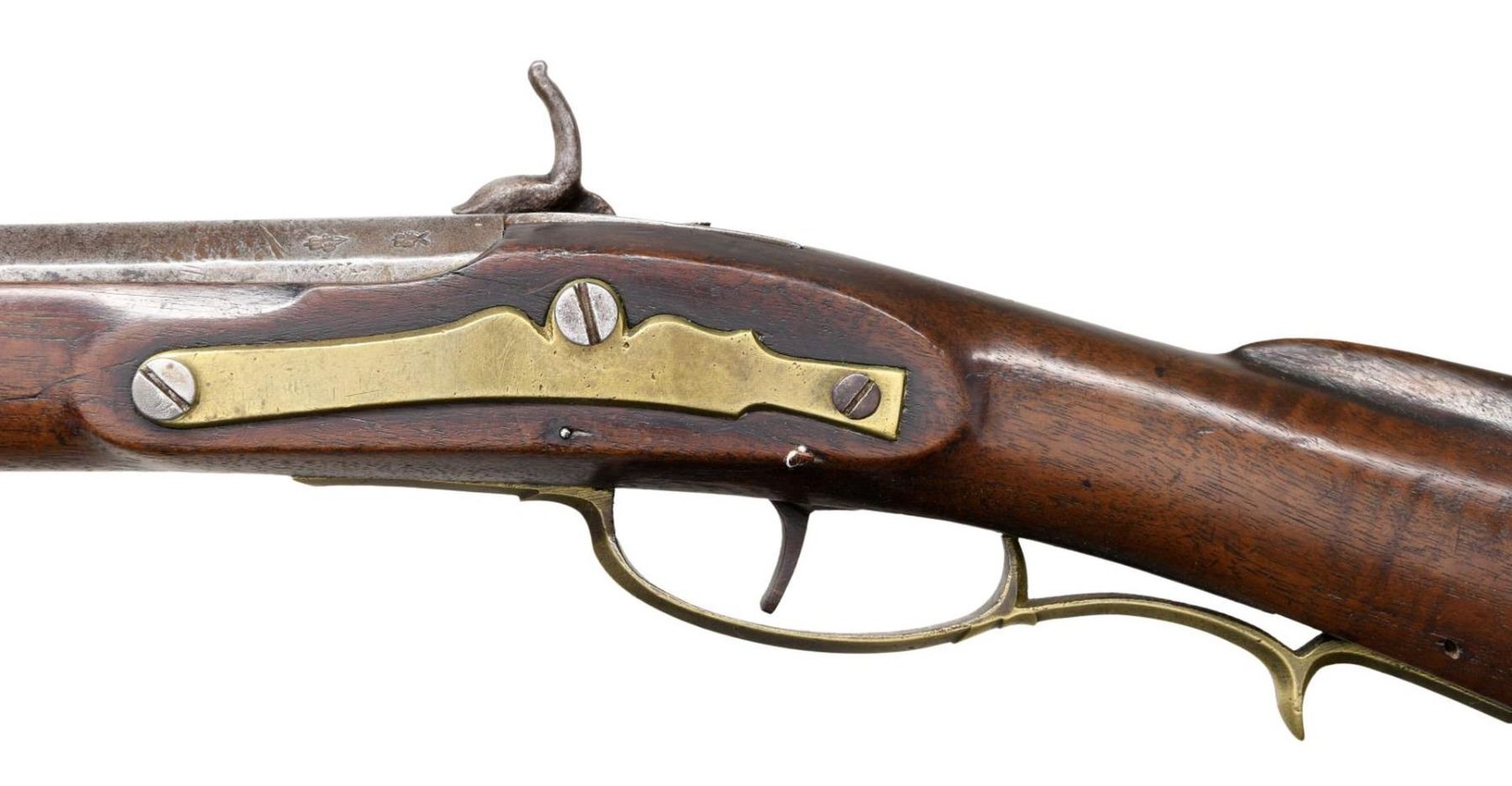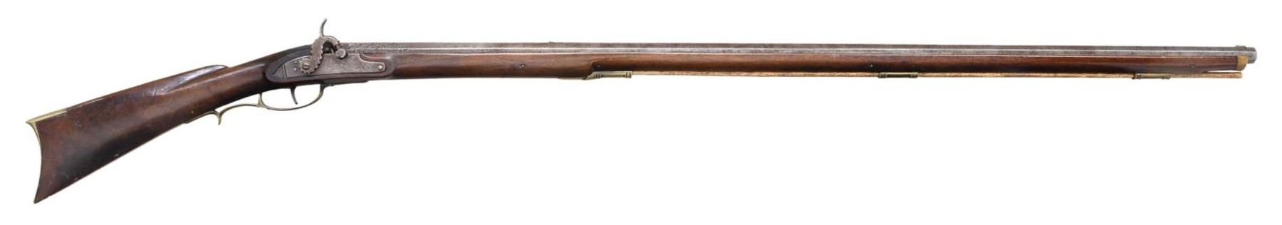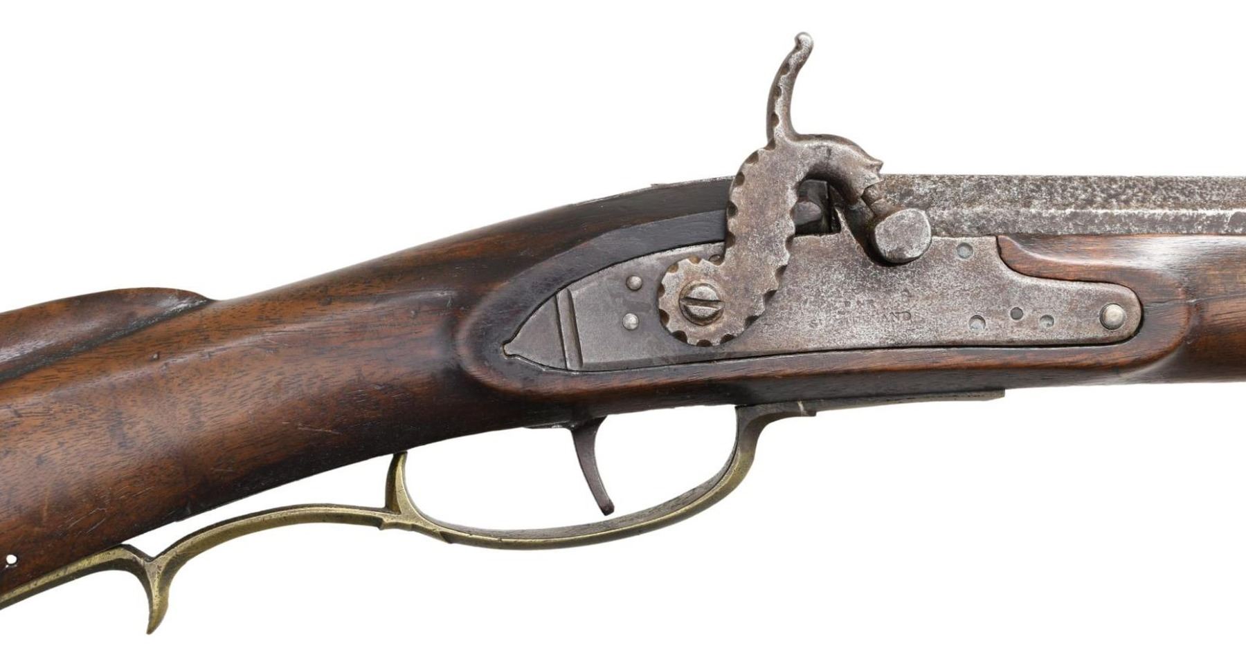 INDIAN RIFLE. From Milton Von Damm collection, added to collection after publication of "The Fur Trade". 60.5" overall, "44.5" octagonal barrel marked "LONDON" with Board of Ordnance proof marks…. The lock is marked R&R over SUTHERAND followed by the Board of Ordnance broad arrow mark. It [lock] Is 5 3/8 inches long, was originally flintlock but was converted to an early barrel percussion system…The stock is in excellent condition with only one small inside repair near the lock. The stock is not the military pattern of known war of 1812 British contract rifles with the Baker style patch box. The stock on this rifle has no patch box and it's more of a trade rifle style. The trigger guard is more elongated than rounded and the trigger is thick and rugged. The ferrules are the same sturdy pattern as the Indian contract rifles". CONDITION: very good as configured. PROVENANCE: Jeffrey Hoare Auction of Robert Band Collection, 2015; Lifelong Collection of author Milton Von Damm. (01-24761/JS). ANTIQUE. $2,000-3,000.