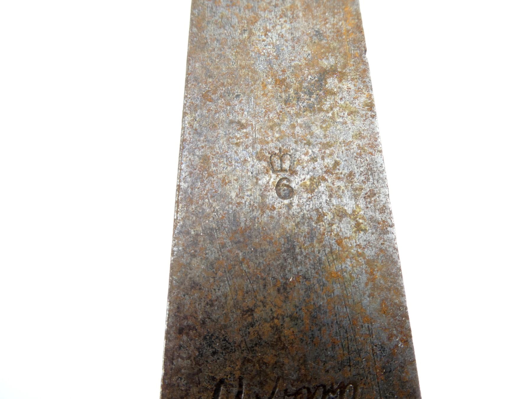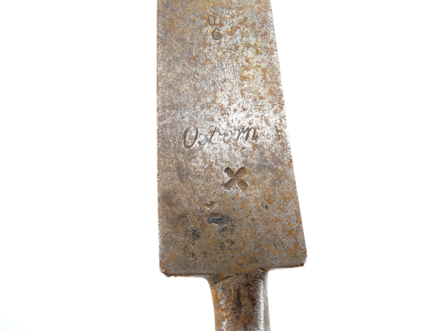 (1) FITS .75 CAL. INDIA PATTERN BROWN BESS MUSKETS, APPROX. 30MM WIDE BLADE, BLADE MARKED: CROWN OVER "6" OVER "OSBORN" OVER "X", NO SCABBARD, MUZZLE RING APPROX. 0.97" DIA., BLADE APPROX. 17" & OAL APPROX. 21 5/8". SEE PHOTOS.