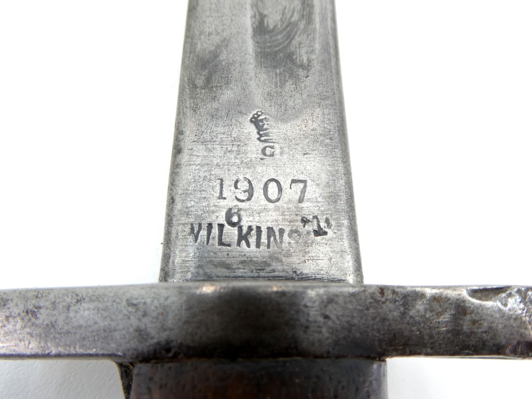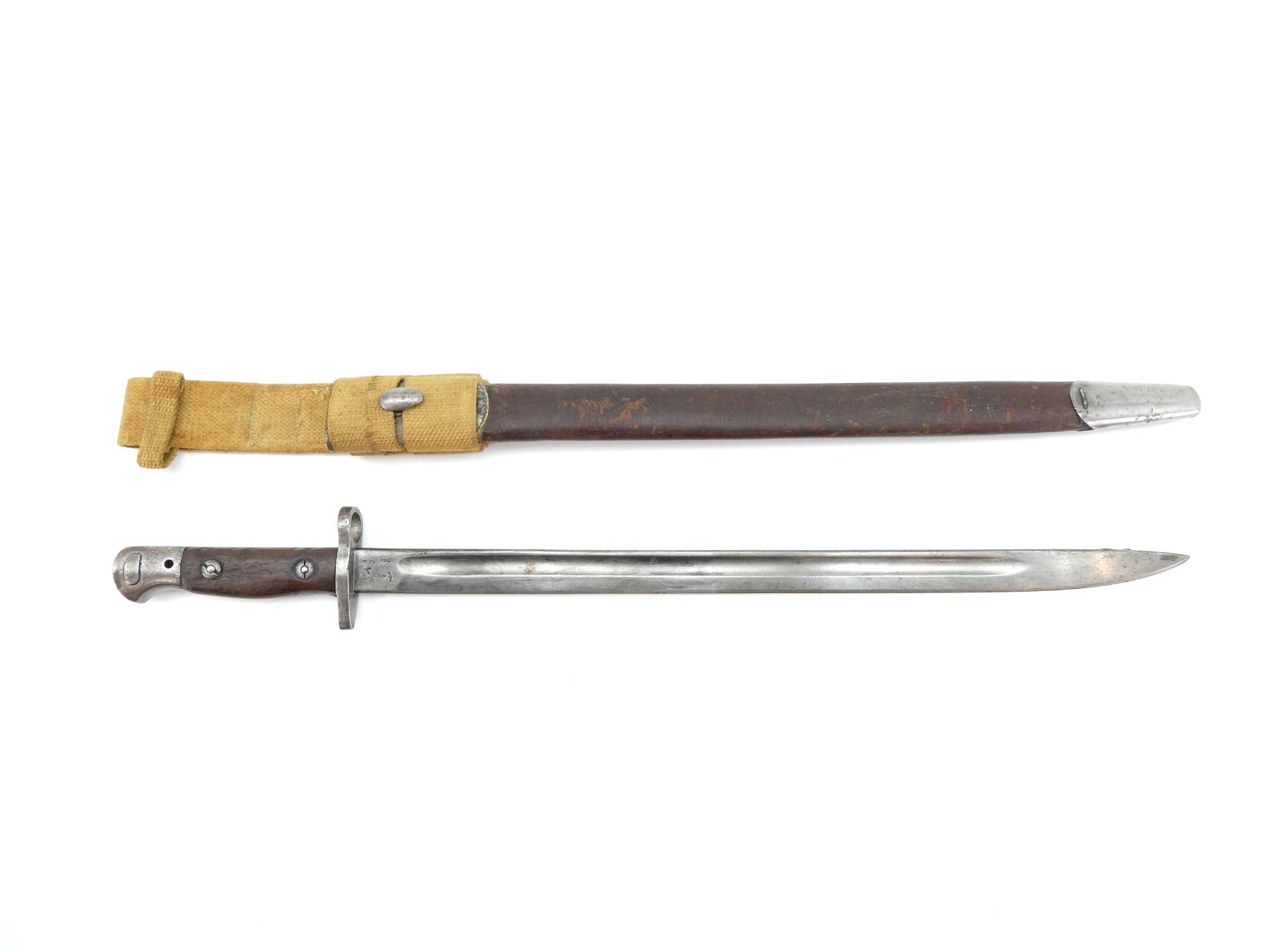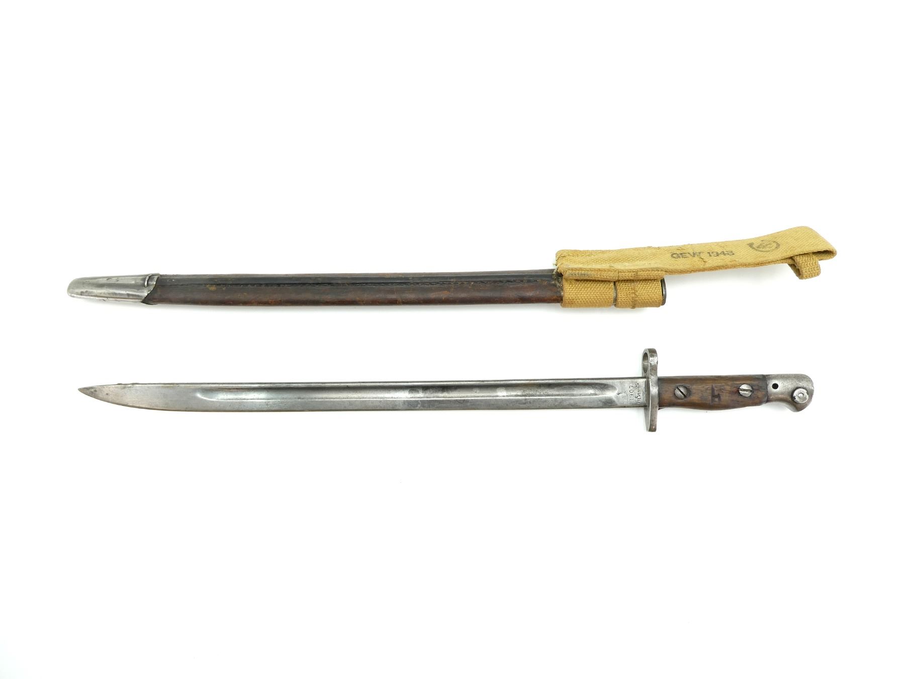 (1) FITS .303 CALIBER SHORT MAGAZINE LEE-ENFIELD NO.I MK.III (SMLE) RIFLES, RICASSO MARKED: "1907" OVER "6 1?" OVER "WILKINSON", OTHER-SIDE MARKED: VARIOUS PROOF MARKS, "X" (BEND TEST) & BROAD ARROW, NO QUILLON, 2-PIECE WOOD GRIPS, METAL POMMEL NO VISIBLE MARKINGS, AUSTRALIAN MILITARY LEATHER & METAL SCABBARD, THROAT MARKED: "D 2 D" & BROAD ARROW, TIP MARKED: "OA", TAN P37 CANVAS FROG MARKED: "GEW 1948" & C-BROAD ARROW, BLADE APPROX. 16.75" & OAL APPROX. 21.75".