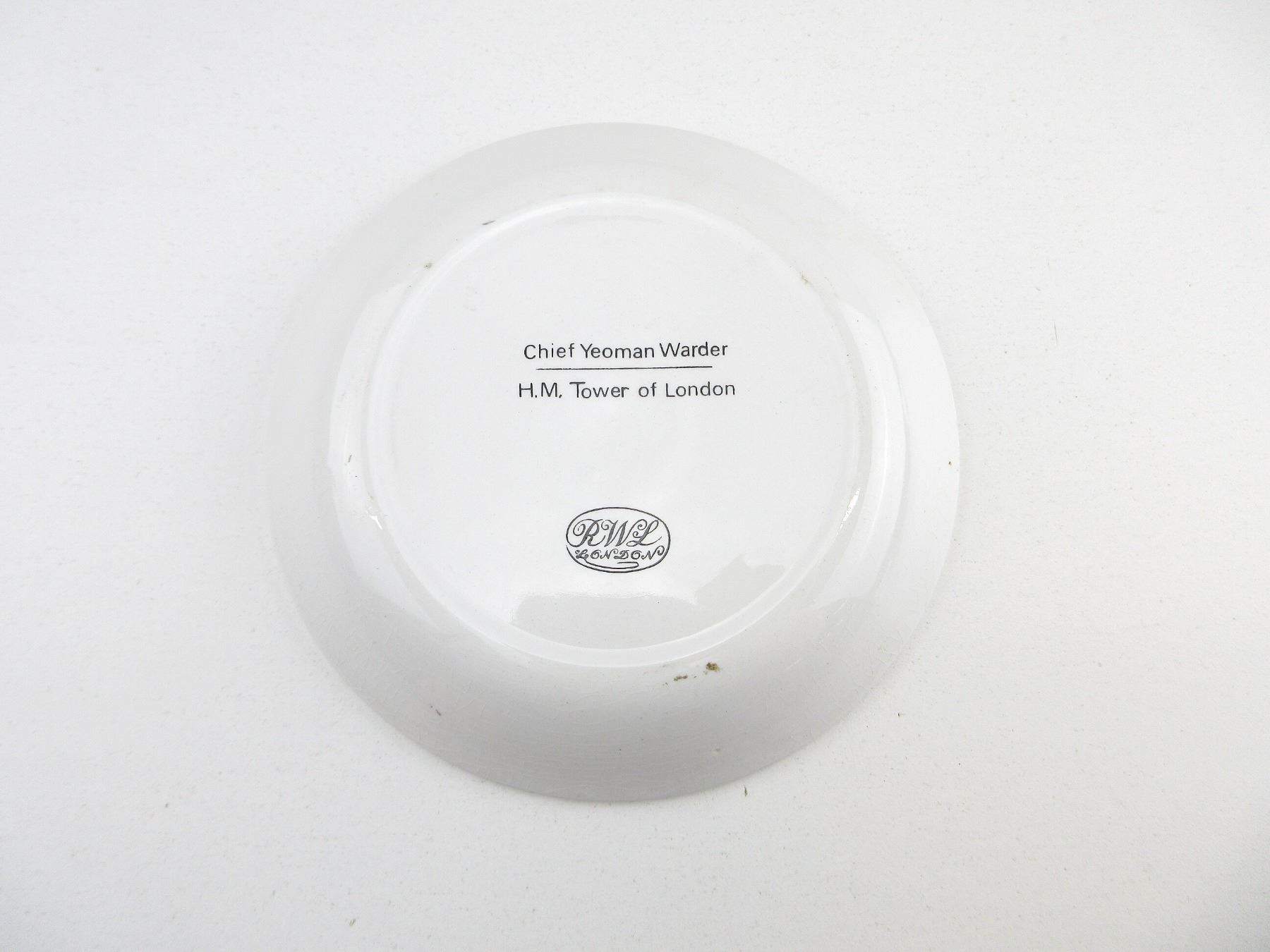 (1) COMMEMORATIVE PLATE WITH IMAGE OF CHIEF YEOMAN WARDER, MARKED: "CHIEF YEOMAN WARDER", OTHER SIDE MARKED: "CHIEF YEOMAN WARDER, H.M. TOWER OF LONDON" & "RWL, LONDON", GOLD COLOURED TRIM ON PLATE, APPROX. 5 5/8" DIA. SEE PHOTOS.