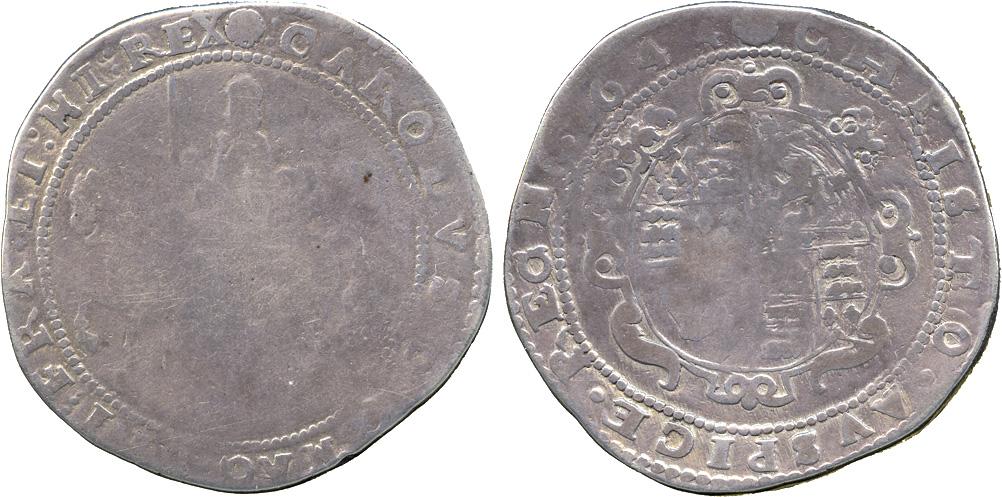 BRITISH COINS. Charles I (1625-1649), Crown, 1664, Exeter, initial mark rose, king on horseback left, sash in large bow, rev round garnished shield, date to the left of initial mark (N 2557; S 3058). Poor to fair, reverse somewhat better, scarce.