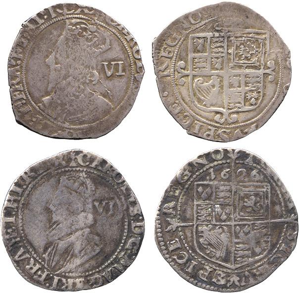 BRITISH COINS. Charles I, Sixpence, 1626, Tower mint, group B, type 1a1, mm cross calvary, second bust left, mark of value behind, rev quartered shield of arms, date above, on long cross fourchée dividing legend and date (N 2236; S 2807); Sixpence, Tower mint, group F, type 43, mm star, sixth “Briot’s” bust left, mark of value behind, rev quartered shield on cross Moline (S 2817). Both fine or better. (2)