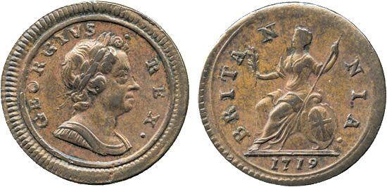 BRITISH COINS. George I, Farthing, second issue, 1719, laureate and cuirassed bust right, smaller lettering, rev Britannia seated on globe (Peck 812; S 3662). Nearly extremely fine.