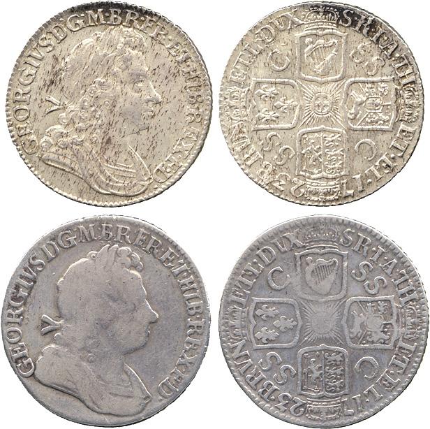 BRITISH COINS. George I, Shilling (2), 1723, first laureate and draped bust right, rev crowned cruciform shields of arms SSC in angles, C/SS in third quarter; and regular SSC (S 3647). Some haymarking, otherwise extremely fine and fine. (2)