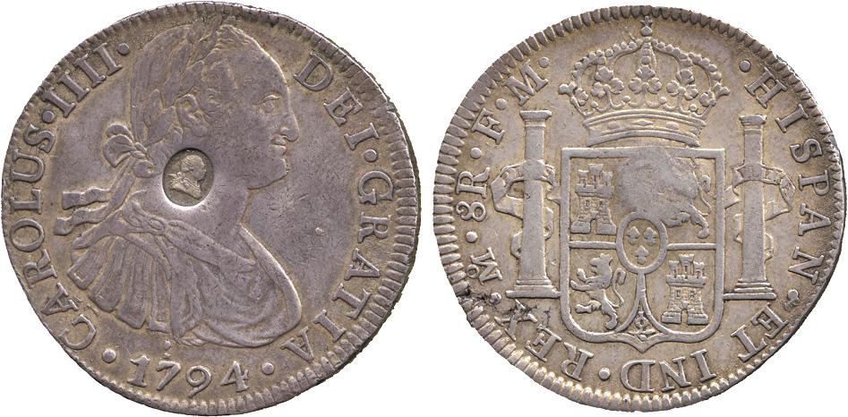BRITISH COINS. George III, Emergency issue, Dollar, oval countermark with bust of George III on Mexico 8-Reales, Mexico mint, 1794 FM, with the portrait of Charles IV of Spain (ESC 129; S 3765A). Host coin very fine, the countermark extremely fine.