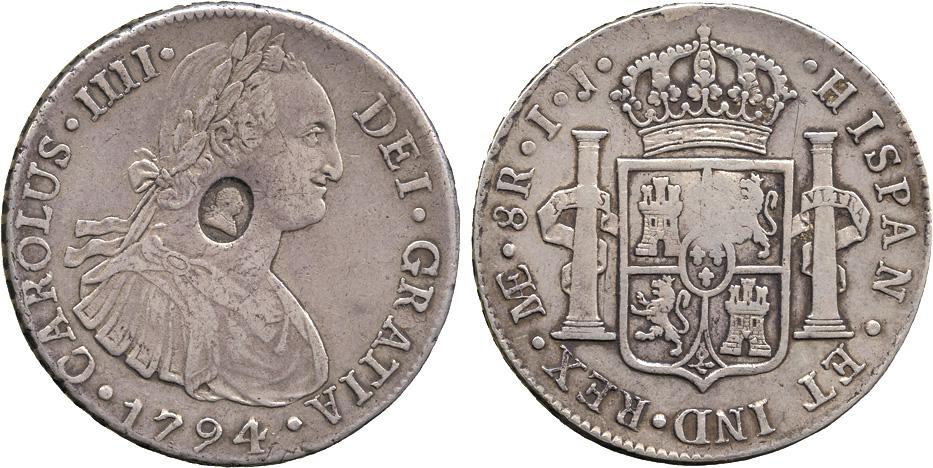 BRITISH COINS. George III, Emergency issue, Dollar, oval countermark with bust of George III on Peru 8-Reales, Lima mint, 1794 IJ, with the portrait of Charles IV of Spain (ESC 133; S 3765A). Very fine.