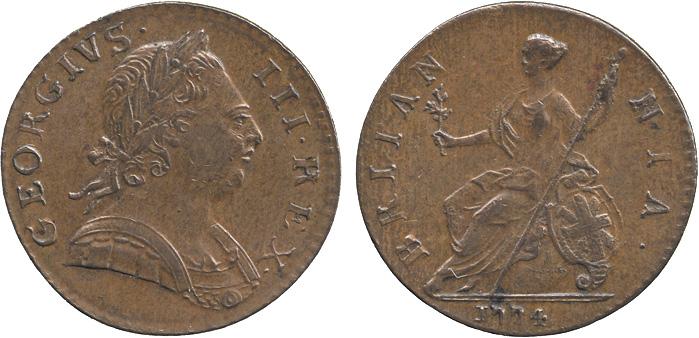 BRITISH COINS. George III, Halfpenny, first issue, 1774, laureate and cuirassed bust right, rev Britannia seated left, date in exergue (S 3774). About extremely fine.