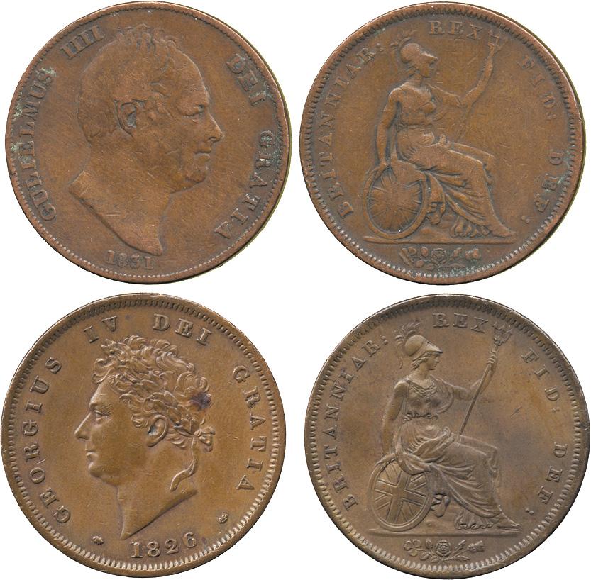 BRITISH COINS. George IV, Penny, 1826, laureate bust left, date below, rev Britannia seated right, thick line on saltire (S 3823); William IV (1830-1837), Penny, 1831, bare head right, date below, W.W on truncation, rev Britannia seated right (S 3846). First almost very fine with a little verdigris, the second fine and extremely rare. (2)