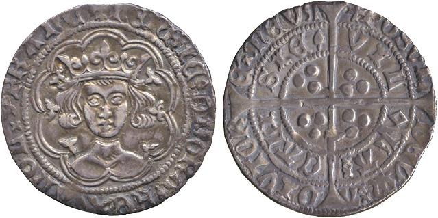 BRITISH COINS. Henry VI, Groat, pinecone-mascle issue, Calais, facing crowned bust within tressure of nine arcs, mintmark cross patonce, rev long cross dividing pellets and inscriptions, mintmark plain cross (N 1461; S 1875). One or two light obverse marks, the reverse slightly double-struck, otherwise attractively toned, good very fine.