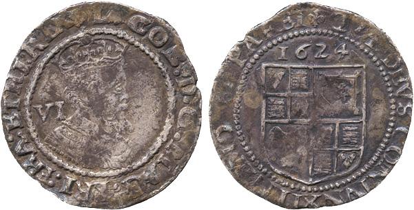 BRITISH COINS. James I, Sixpence, 1624, third coinage, mm lis, sixth bust left, mark of value behind, rev quartered shield of arms, date above (S 2670). Toned, almost very fine.