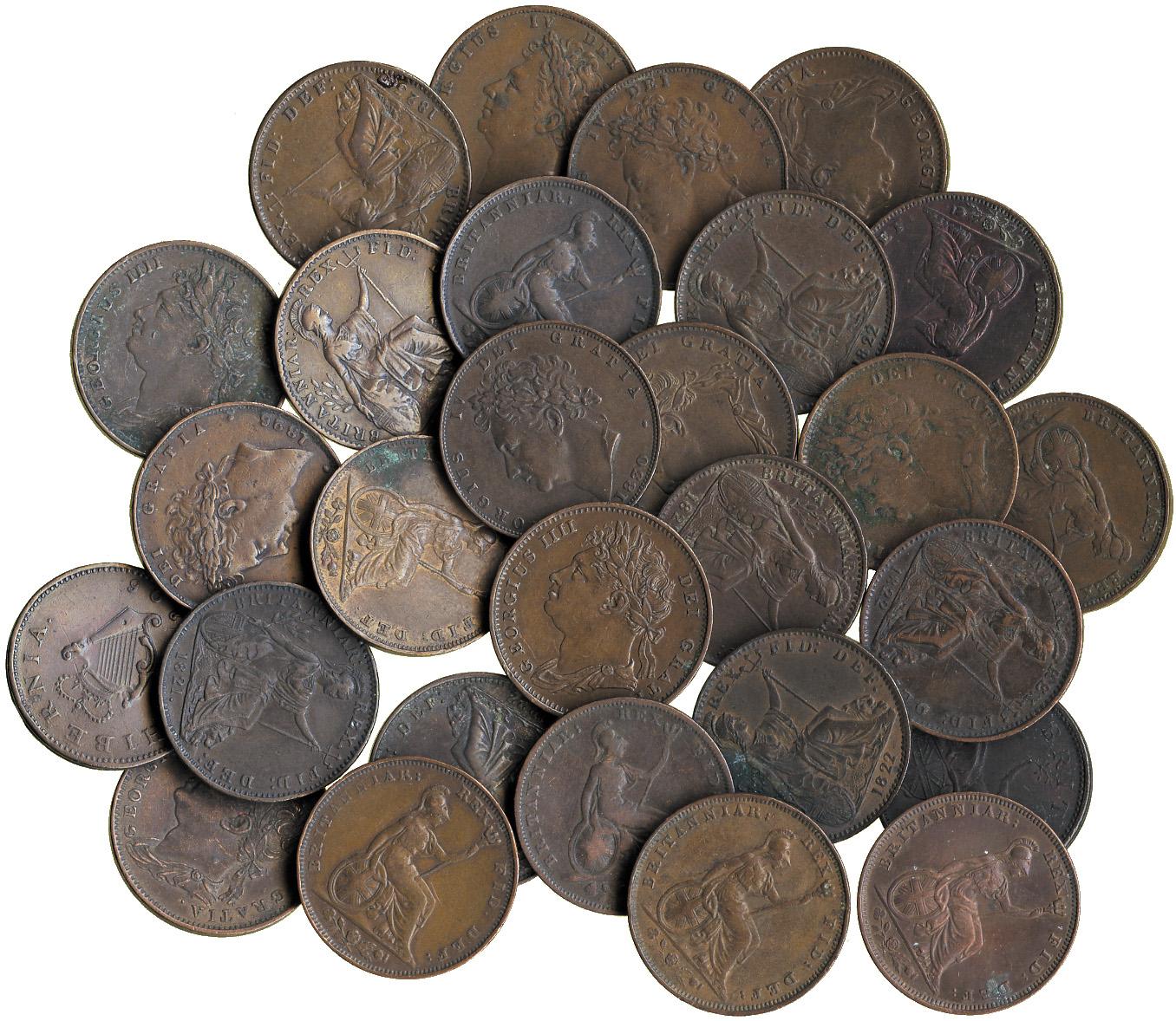 BRITISH COINS. MISCELLANEOUS. George III and William IV, British and Irish Farthings (28), 1806 (Hib), 1806, 1821, 1822 (7), 1823 (3), 1825 (2), 1826 (LH), 1826 (BH – 7), 1828, 1829, 1830 (2), 1836. Fine to good very fine. (28)
