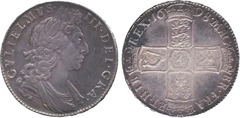 BRITISH COINS. William III, Halfcrown, 1698 DECIMO, first laureate, draped and cuirassed bust right, rev crowned cruciform shields, Lion of Nassau at centre (S 3494). Toned, very fine.