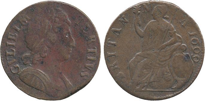 BRITISH COINS. William III, Halfpenny, 1699, unbarred A’s on reverse, laureate and cuirassed bust right, rev Britannia seated left (P 674; S 3555). Fine.