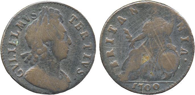 BRITISH COINS. William III, Halfpenny, 1700, third type, laureate and cuirassed bust right