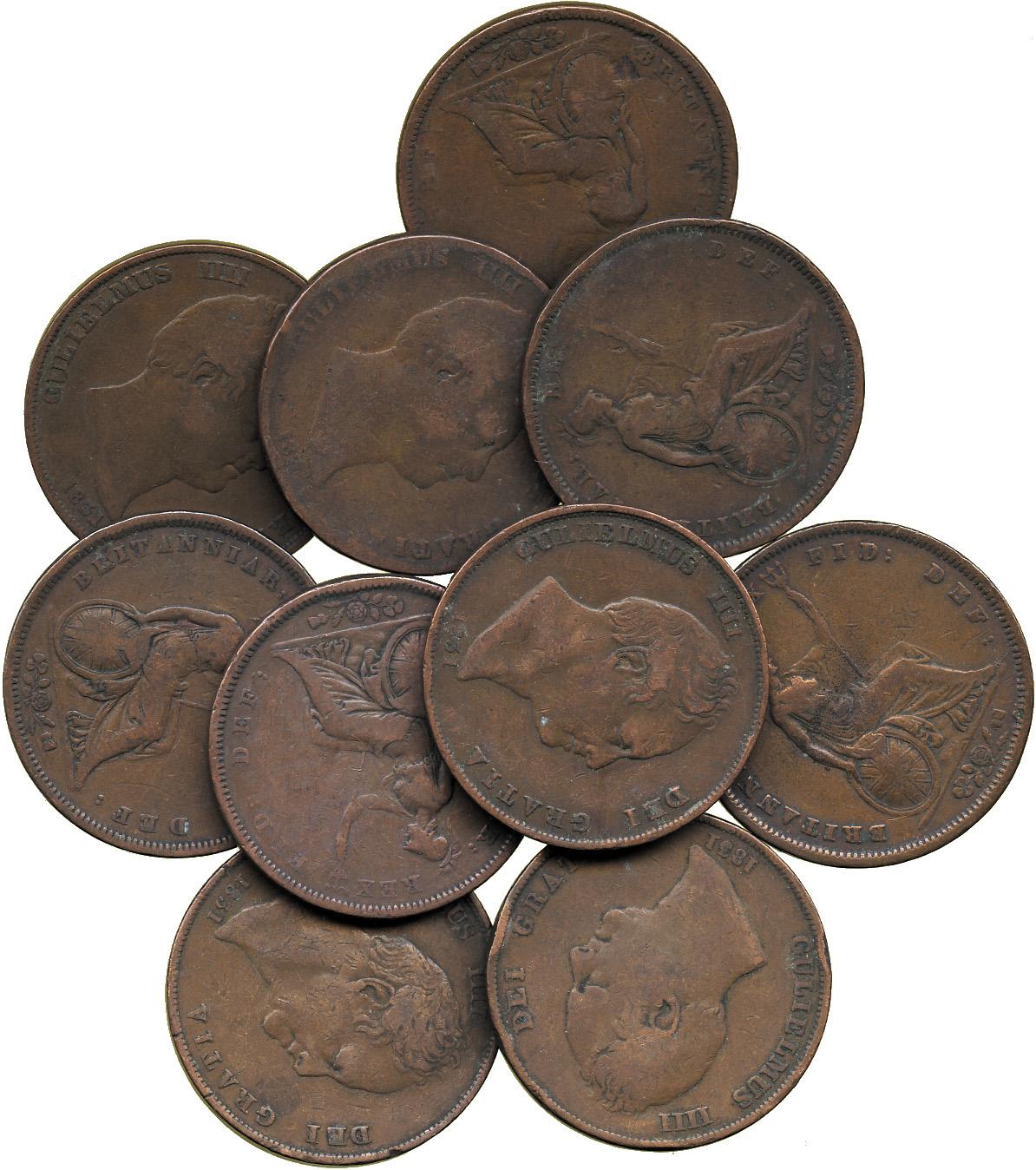 BRITISH COINS. William IV (1830-1837), Pennies (10), 1831, bare head right, date below, .W.W on truncation (4), no initials on truncation (6), rev Britannia seated right (S 3845, 3846). Generally fair to fine. (10)