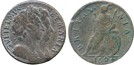 BRITISH COINS. William and Mary, Farthing, 1694, conjoined laureate busts right, all stops