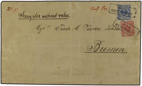 1893 (Sept 2) Cover endorsed "Samples Without Value" from Quittah with sender´s cachet on reverse (Bremer Factorei) sent to Bremen with Germany 1889 10pf. red and 20pf. blue tied by framed ´AUS/WESTAFRIKA´ in black. A very scarce cover. Scott 48,49.