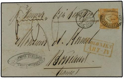 1855 (Dec 8) Cover from Melbourne to France endorsed ´per Emma via Liverpool´ with single imperf. 6d. orange tied by Melbourne ´1/V´ obliterator. Rare framed ´Colonies/Art-18´ in red Accountancy marking below; reverse with "Australian Packet/Liverpool" cds (March 26) in black. Slight imperfections but a rare usage that opens well for exhibit display.
