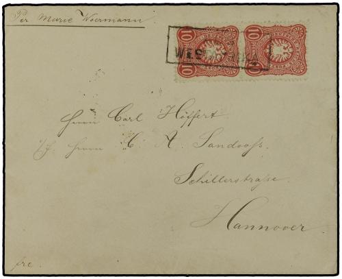 1889 (April 3) Cover from Quittah endorsed ´per Marie Woermann´ franked by 1880 10pf. red vertical pair tied by framed ´AUS/WESTAFRIKA´ in black. Hannover arrival (May 8) on reverse of rare and delightful cover. Scott 39.