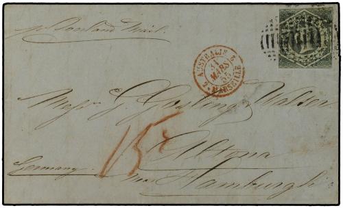 1855 (Jan 22) Large part entire letter from Sydney to Altona (Denmark), via Hamburg franked by single 1854 5d. greenish grey tied by dumb black obliterators. Fine strike of ´Australie/2/Marseille´ (March 31) well struck in red on front and charged ´15´ skilling due in red crayon on arrival. An unusual destination. Signed Pothion. SG 116.