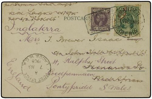 1905 (Aug 7) Postcard of Cape Palmas used from Harper to Fernando Po, readdressed to Wales. Franked by Official 1903 3c. green tied Harper cds, then franked by Fernando Po 10c. violet tied by Santa Isabel datestamp in blue, thence via Lagos to Pontypridd. A most unusual card.