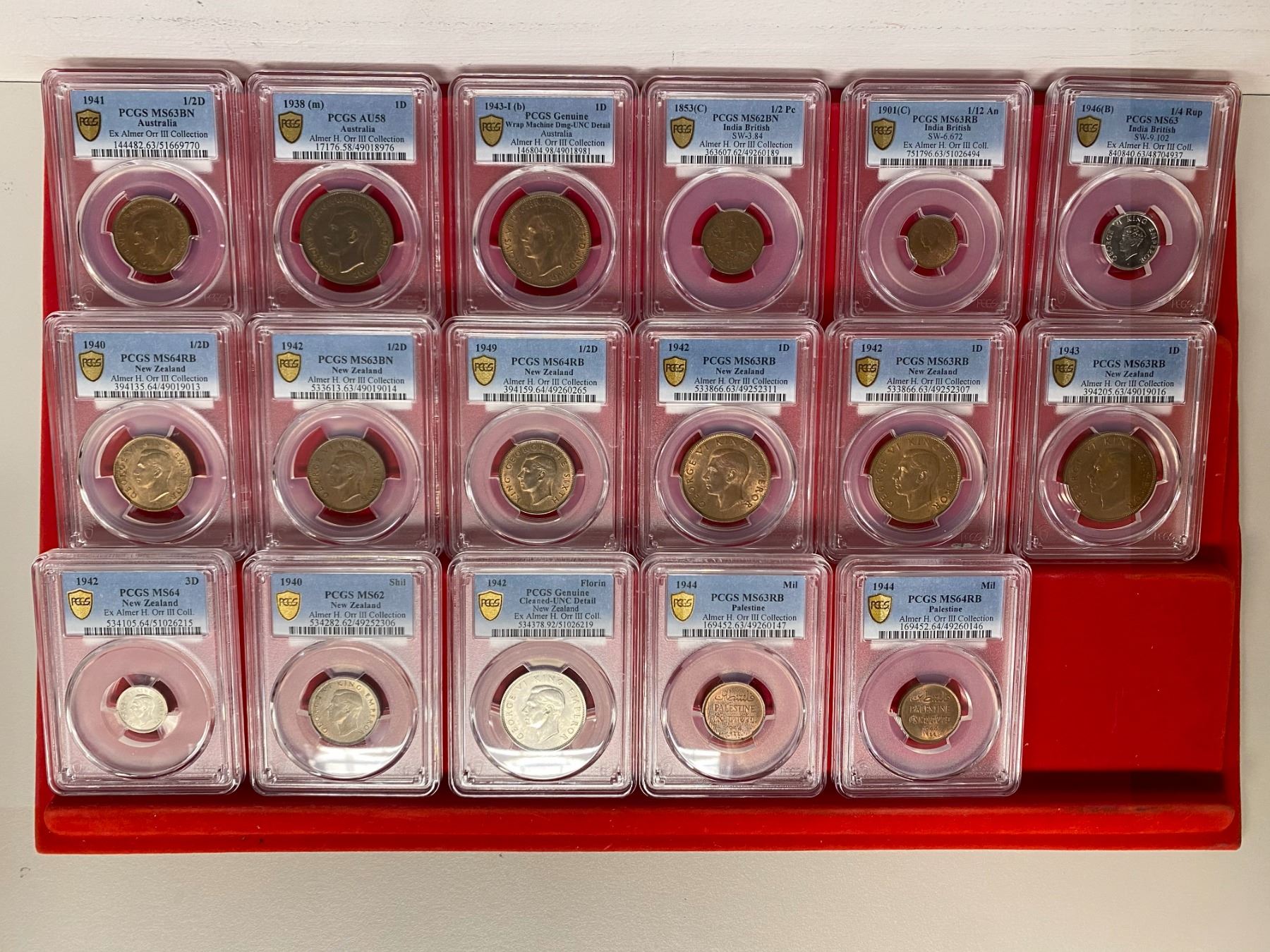 BRITISH COMMONWEALTH: LOT of 17 coins, a diverse group of PCGS graded coins including; Australia AE ½ penny 1941 MS-63BN, AE penny 1938 AU-58, AE penny 1943-I UNC details, British India AE ½ pice 1835(c) MS-62BN, AE 1/12 anna 1901(c) MS-63RB, ¼ rupee 1946(b) MS063, New Zealand AE ½ penny 1940 MS-64RB, AE ½ penny 1942 MS-63BN, AE ½ penny 1949 MS-64RB, AE penny 1942 MS-63RB, AE penny 1942 MS-63RB, AE penny 1943 MS-63RB, AR 3 pence 1942 MS-64, AR shilling 1940 MS-62, AR florin 1942 UNC details, Palestine Mandate AE mil 1944 MS-63RB, AE mil 1944 MS-64RB, a lovely group of slabbed coins, retail value $600, lot of 17 coins, ex Almer H. Orr III Collection.