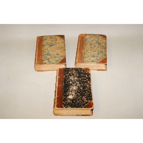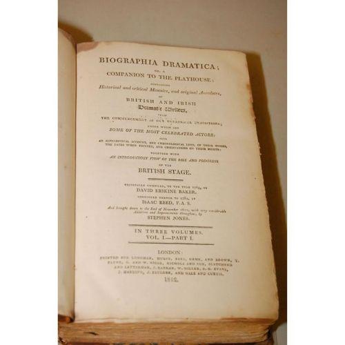 BRITISH DRAMA. A Group of 3 Volumes as Listed. 8vo - over 7¾" - 9¾" tall. Hard Cover. Ex-Library. Good Condition. ***Biographia Dramatica or, A Companion to the Playhouse: Containing Historical and Critical Memoirs, and Original Anecdotes, of British and Irish Dramatic Writers, originally compiled 1764 by David Erskine Baker. Continued Thence to 1782 by Isaac Reed. And Brought down to the End of November 1811 by Stephen Jones. 3 Volumes bound in 2. Complete. (1812) London: Printed for Longman, Hurst, Rees..... Bound in 3/4 leather & marbled paper, raised bands on spines, marbled endpapers, top edges gilt, deckled page edges. Bindings tight. ***The Modern British Drama - Volume the Third - Comedies (1811) London: Printed for William Miller. Bound in 3/4 leather & marbled paper, raised bands on spine. Scuffed covers, edge/corner wear, binding & hinges tight.
