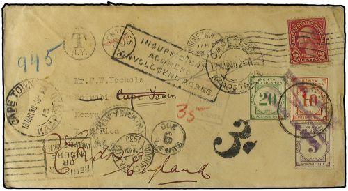 1930 Underpaid envelope from the United States bearing 2 cents red (Scott 332) tied by WINNETKA datestamp addressed to Kenya with Kenya postage dues 5 c violet (SG D1), 10 c vermilion (SG D2) and 20 c yellow green (SG D3) tied by NAIROBI datestamp forwarded to Cape Town with boxed instructional INSUFFICIENT ADDRESS and redirected to England with tax 3d and returned to New York with Tax DUE 6 CENTS handstamp. Fine item of postage due mail.