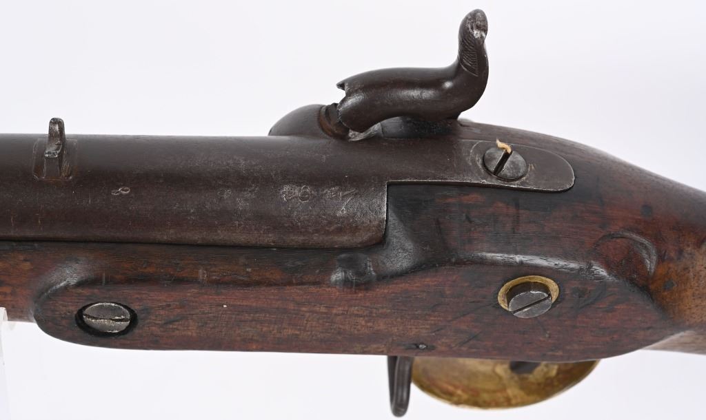 BARREL 39 1/4" . CALIBER .75 Lock is stamped with standing Lion. Barrel is stamped with two British proofs. Features single brass fore-end tip, all furniture is brass, single leaf standing rear sight, full length walnut stock, metal ramrod and sling swivels. Condition. Metal is deep brown patina. Wood is very good with a hair line crack near muzzle and wood repairs over retaining barrel wedges. ANTIQUE