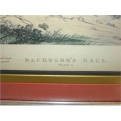 FRAMED BRITISH FOX HUNT PRINT. Titled "Bachelor's Hall-Plate 4". Depicts fox hunters on horses with hounds. 19.5" x 17.75" framed