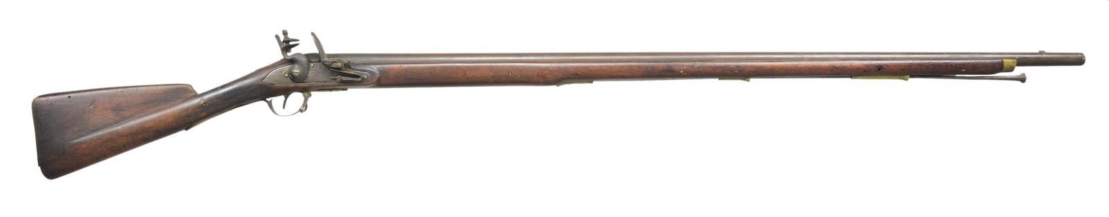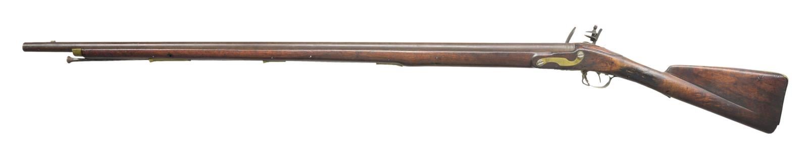 FLINTLOCK. Cal. 69. NSN. Bbl. 40" w/ stud front sight. Lock has Crown over "W. KETLAND". Pinned full length walnut stock w/ long fluted comb & brass furniture. Tulip tip iron ramrod. CONDITION: Bbl. has consistent brown patina appearance w/ heavy pitting around touch hole. Lock appears period replacement w/ small gaps to wood; hammer appears replacement. Good wood finish missing front sling swivel, numerous dents & scratches, remnants of 2 rectangular bands on wrist, large open & repair cracks throughout. Triggerguard warping proud of wood. Brass buttplate missing large portion at toe. Sideplate screws & hammer screw show distortion. PROVENANCE STATEMENT: Estate collection of Thomas F. Wolfinger. (01-22181/MD). $300-500.