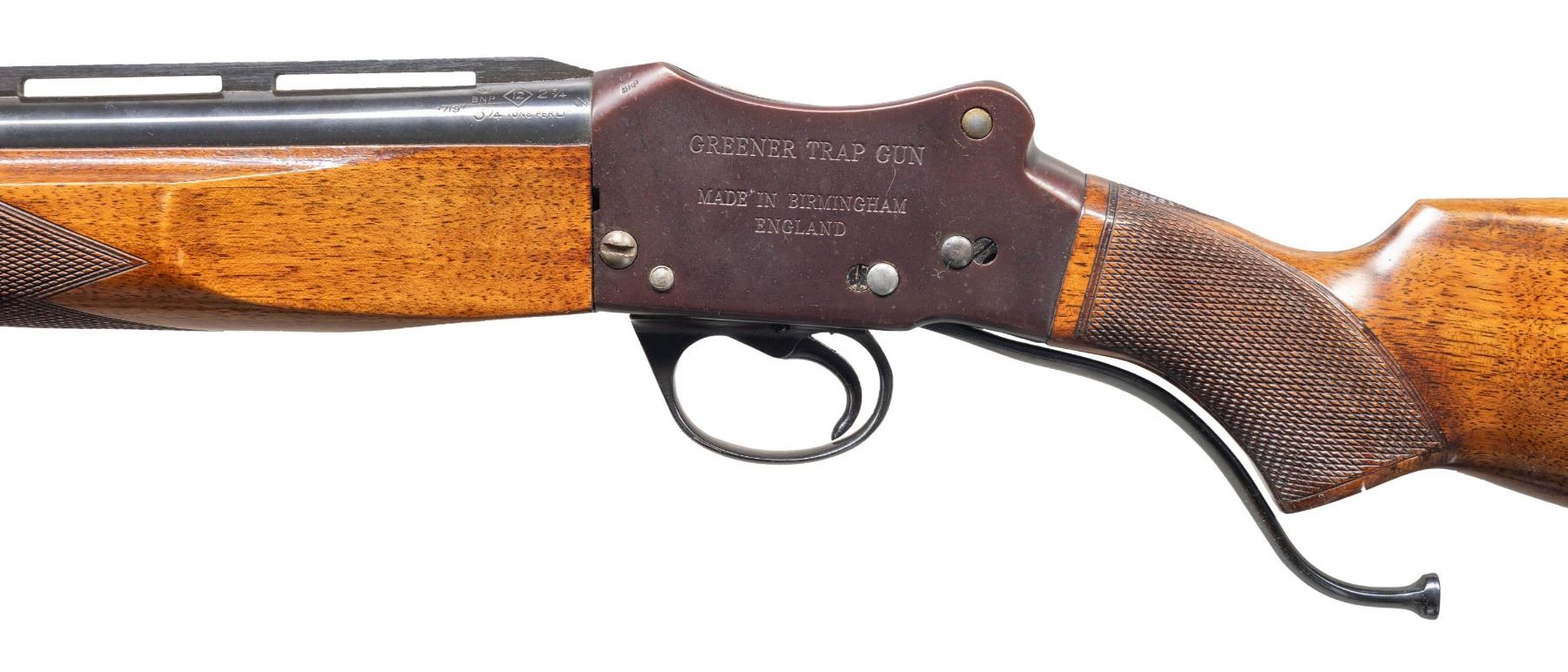 Cal. 12 Ga., 2 3/4". S# T69282. Mfg. 1969 with Birmingham "UB" Nitro proofs. VR 32" bbl. w/ steel bead & Full choke. Checkered walnut stock set w/ semi-beavertail forearm, Monte Carlo comb. LOP: 14.75" over cut stock having added adj. shims having Decelerator pad. CONDITION: very good blue with plum hue to receiver. Wood has very good finish with minor handling marks. Very good shiny bore. (25-4609/MD). MODERN. $550-850.